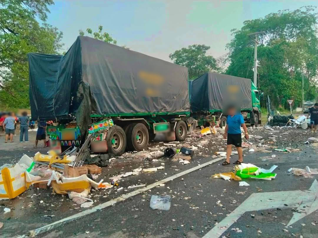 ที่เกิดเหตุ พบรถกระบะ อีซูซุ สีขาว ป้ายทะเบียน สมุทรสงคราม สภาพพังเสียหายทั้งคัน และอาหารทะเลที่บรรทุกมาด้วย ตกกระจัดกระจายเต็มพื้นถนน ห่างออกไป พบรถขนถ่ายการเกษตร สีเขียว ป้ายทะเบียน อุตรดิตถ์ สภาพหน้ารถพังซ้ายพังเสียหาย และพบรถพ่วง อีซูซุ สีเขียว ป้ายทะเบียน พะเยา จอดอยู่ข้างทาง