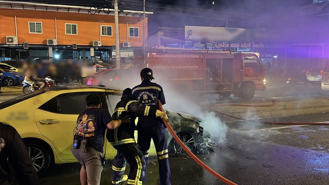 ที่เกิดเหตุไฟกำลังลุกไหม้รถแท็กซี่ สีเหลือง ทะเบียน กทม. เจ้าหน้าที่เร่งใช้น้ำทำการฉีดดับ โดยต้องใช้ความระมัดระวัง ซึ่งรถคันดังกล่าวใช้เชื้อเพลิงประเภทก๊าซ NGV และน้ำมันเบนซิน ทางเจ้าหน้าที่ใช้เวลาประมาณ 30 นาที จนสามารถควบคุมเพลิงได้ หลังเพลิงสงบพบว่ารถนั้นเสียหายที่บริเวณห้องเครื่องและห้องผู้โดยสาร