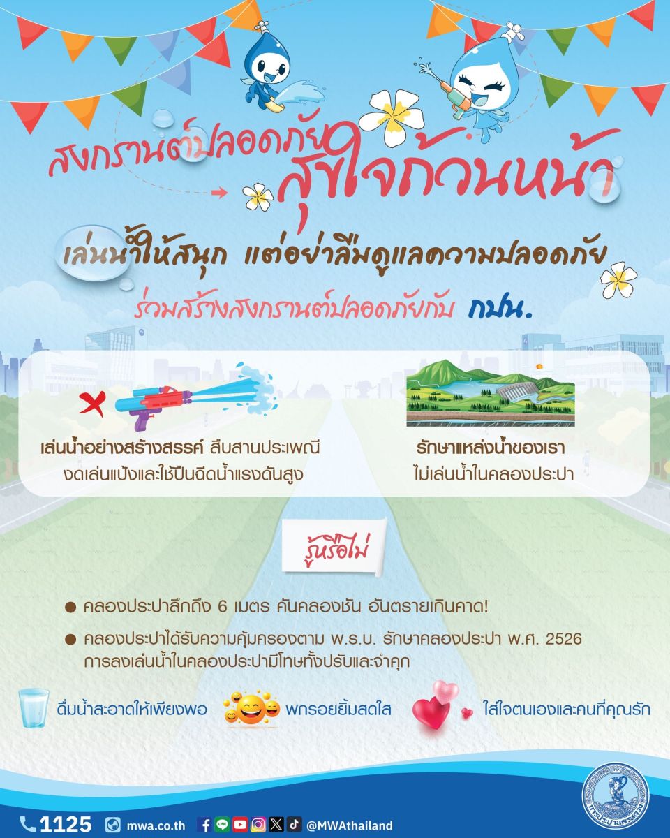 การประปานครหลวง (กปน.) ร่วมส่งเสริมเทศกาลสงกรานต์อย่างปลอดภัย พร้อมขอความร่วมมือประชาชนและนักท่องเที่ยว งดเว้นพฤติกรรมที่เสี่ยงอันตรายทั้งต่อชีวิตและทรัพย์สิน รวมถึงการละเมิดกฎหมาย โดยเฉพาะการลงเล่นน้ำในคลองประปา ซึ่งนอกจากจะก่อให้เกิดอันตรายแล้ว ยังอาจส่งผลกระทบต่อคุณภาพน้ำดิบที่ใช้ผลิตน้ำประปา