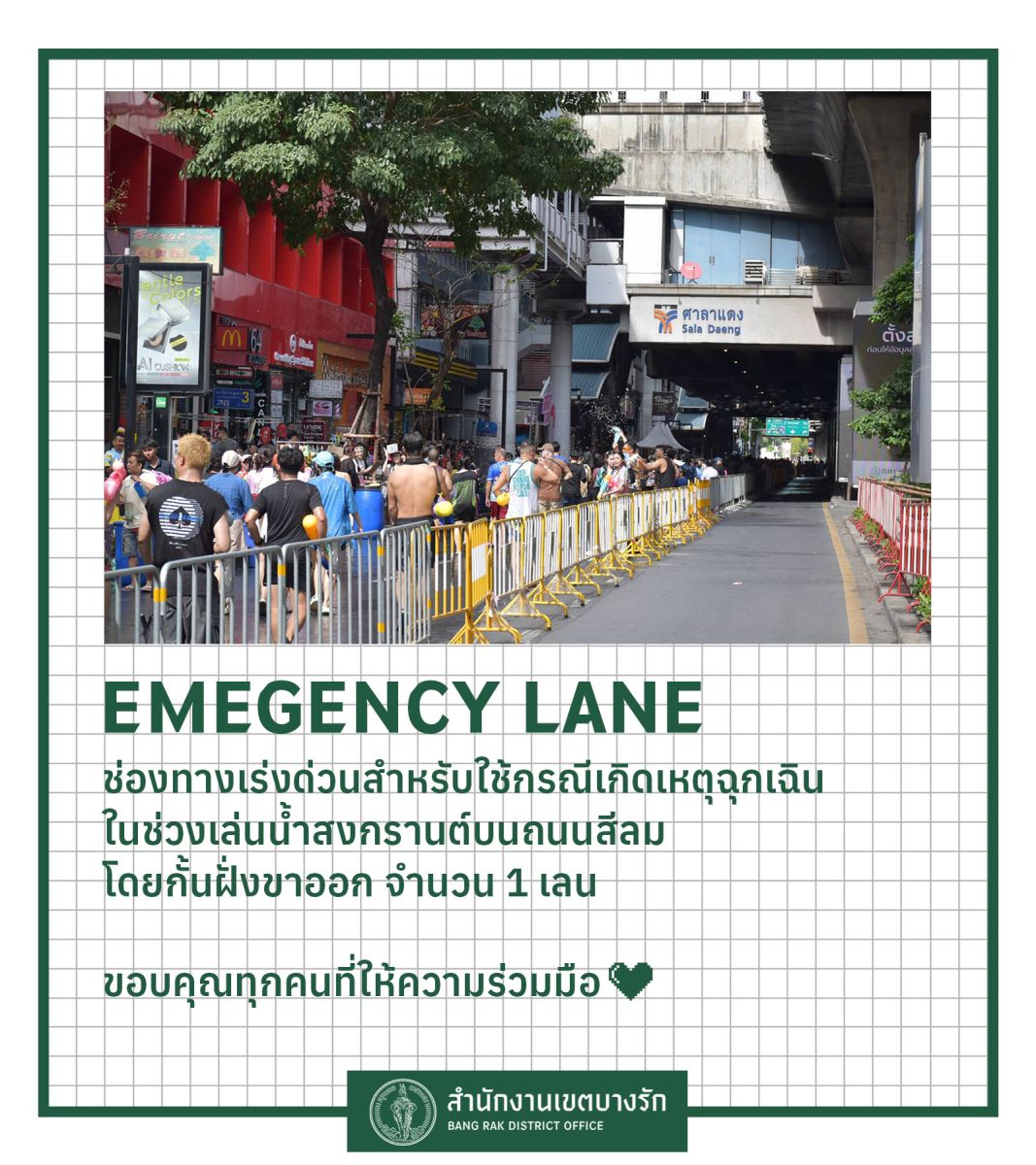 ใครที่เพิ่งมาเล่นน้ำสงกรานต์สีลมเป็นปีแรก อาจจะสงสัยว่าทำไมเราถึงปิดเลนจราจร ถ.สีลม ฝั่งขาออก โดยมีแผงเหล็กกั้นเอาไว้ 1 ช่อง นั่นเพื่อใช้เป็น "ช่องทางเร่งด่วน (Emergency Lane)" สำหรับใช้กรณีเกิดเหตุฉุกเฉินขึ้นนั่นเอง