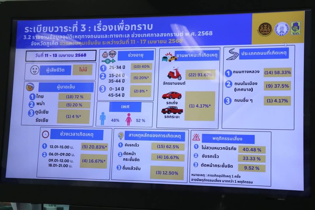 การประชุมรายงานข้อมูลอุบัติเหตุประจำวันที่ 13 เมษายน 2568 ซึ่งเป็นวันที่ 3 ของการรณรงค์ พบว่าเกิดอุบัติเหตุ 15 ครั้ง มีผู้บาดเจ็บ 15 ราย โดยยังไม่พบผู้เสียชีวิต สาเหตุหลักของอุบัติเหตุยังคงเป็น “การขับรถเร็วเกินกว่ากฎหมายกำหนด” รองลงมาคือ “การตัดหน้ากระชั้นชิด“ และการดื่มเครื่องดื่มแอลกอฮอล์” ซึ่งที่ประชุมได้เน้นย้ำให้ดำเนินการตรวจวัดระดับแอลกอฮอล์กับผู้บาดเจ็บทุกรายที่เข้ารับการรักษาในโรงพยาบาลสถิติสะสมระหว่างวันที่ 11 – 13 เมษายน 2568 จังหวัดภูเก็ตมีอุบัติเหตุ ผู้บาดเจ็บ 15 ครั้ง ถือเป็นตัวเลขสูงสุดในประเทศ รองลงมาคือ ชุมพร (14 ครั้ง) พัทลุง และลำปาง (13 ครั้ง)