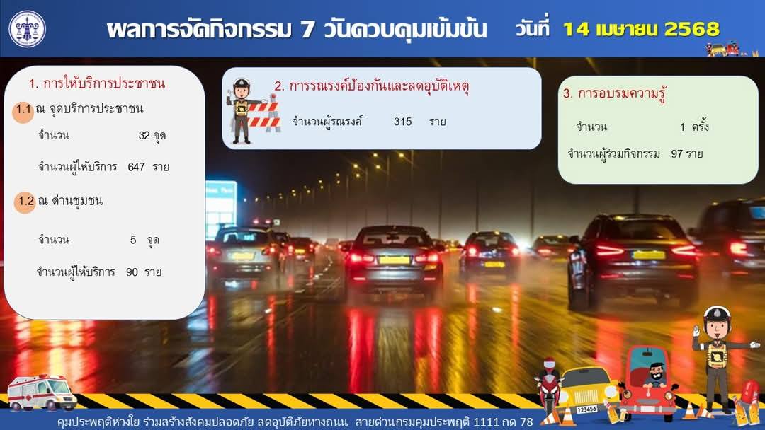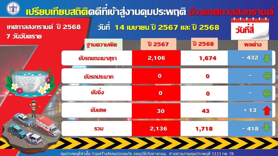 โดยยอดคดีสะสมช่วงควบคุมเข้มข้น 11-14 เมษายน 2568 รวม 3,297 คดี ติดอุปกรณ์ EM รวม 25 ราย ซึ่งจังหวัดที่มีคดีเมาขับสูงสุด ได้แก่ กรุงเทพมหานคร 295 คดี นนทบุรี 242 คดี และสมุทรปราการ 226 คดี ทั้งนี้ เมื่อเปรียบเทียบสถิติคดีเข้าสู่การคุมความประพฤติวันที่ 4 ของปี 2567 พบว่า มีคดีขับรถขณะเมาสุรา จำนวน 2,106 คดี และ ปี 2568 มีจำนวน 1,674 คดี ลดลง 432 คดี