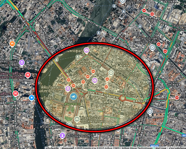 เวลา 22.30 น. วันที่ 15 เมษายน 2568 ถนนราชดำเนิน ตั้งแต่สะพานสมเด็จพระปิ่นเกล้า - แยกผ่านพิภพ - แยกคอกวัว - อนุสาวรีย์ประชาธิปไตย