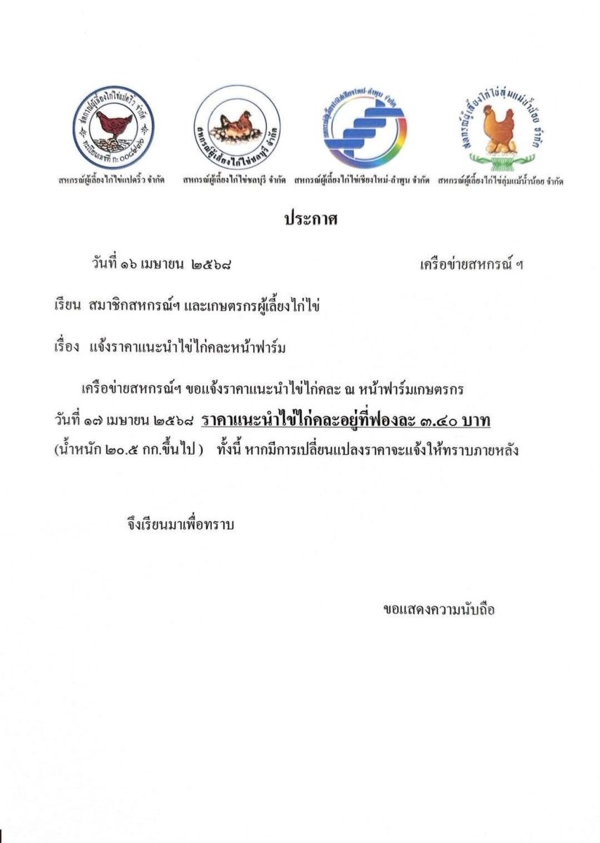 16 เมษายน 2568 ผู้สื่อข่าวรายงานว่า เครือข่ายสหกรณ์ ประกอบด้วย สหกรณ์ผู้เลี้ยงไก่ไข่แปดริ้ว จำกัด, สหกรณ์ผู้เลี้ยงไก่ไข่ชลบุรี จำกัด, สหกรณ์ผู้เลี้ยงไกไข่เชียงใหม่-ลำพูน จำกัด และสหกรณ์ผู้เลี้ยงไก่ไข่ลุ่มแม่น้ำน้อย จำกัด ได้แจ้งราคาแนะนำไข่ไก่คละหน้าฟาร์มเกษตรกร น้ำหนัก 20.5 กิโลกรัมขึ้นไป อยู่ที่ฟองละ 3.40 บาท โดยเป็นการปรับขึ้น 20 สตางค์ต่อฟอง หรือแผงละ 6 บาท จากก่อนหน้าราคาอยู่ที่ 3.20 บาทต่อฟอง มีผลวันที่ 17 เมษายน 2568
