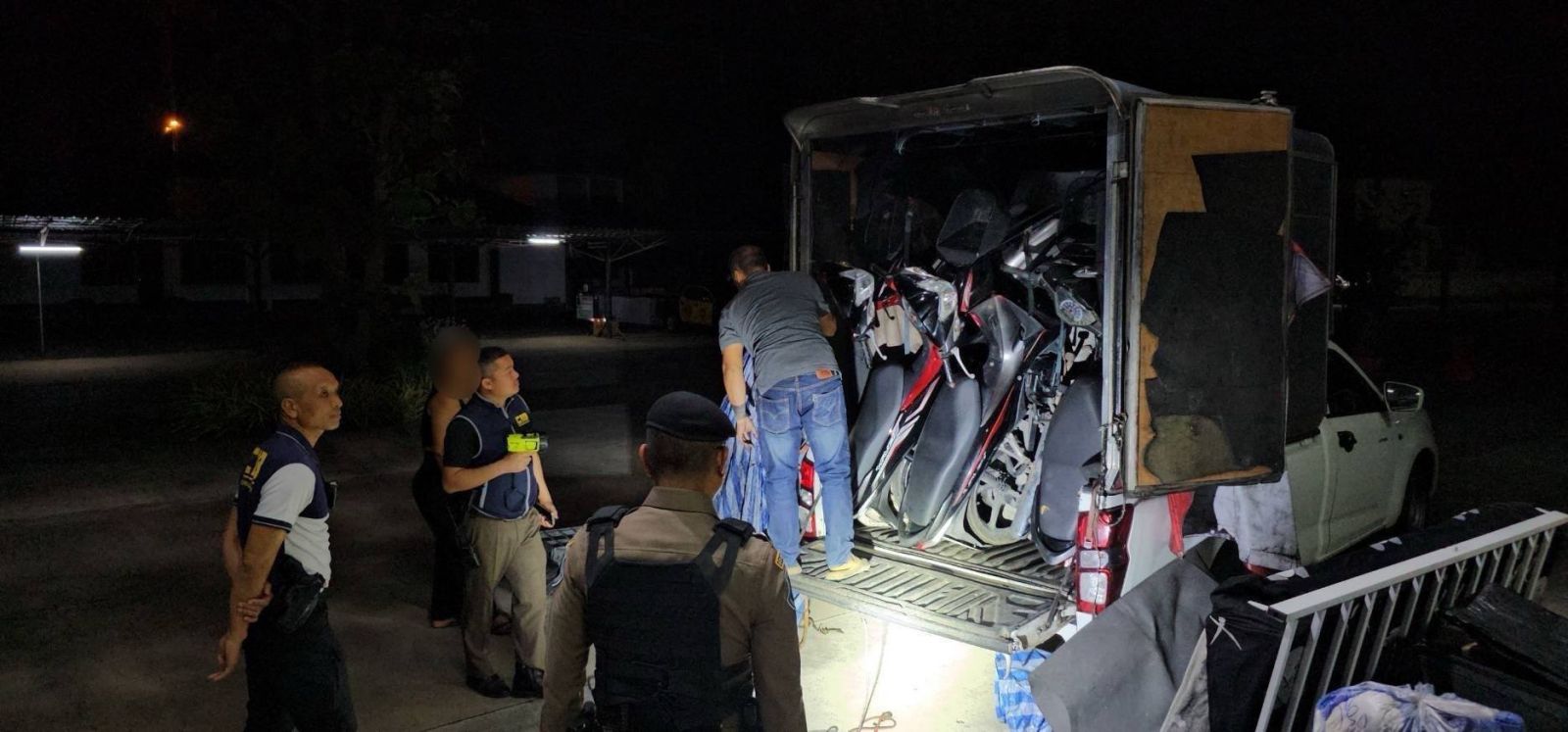 ตำรวจสอบสวนกลาง (CIB) โดย กองบังคับการตำรวจทางหลวง ร่วมกันจับกุมผู้ต้องหา 2 ราย พร้อมยึดของกลาง รถกระบะตู้ทึบ สีขาว จำนวน 1 คัน ,รถจักรยานยนต์ จำนวน 9 คัน โดยจับกุมได้ บริเวณ ทล.2050 กม.23-24 อ.เหล่าเสือโก้ก จ.อุบลราชธานี