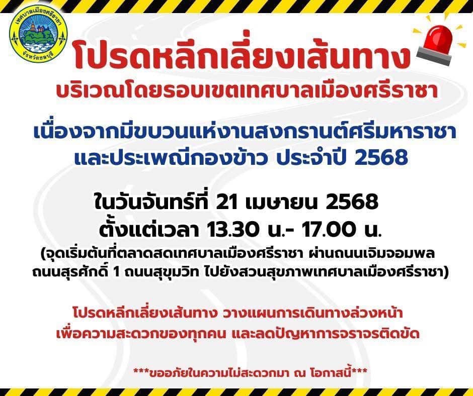 เทศบาลเมืองศรีราชา ประชาสัมพันธ์ แนะเลี่ยงเส้นทาง เนื่องจาก มีการเส้นทางขบวนแห่งานสงกรานต์ศรีมหาราชาและประเพณีกองข้าว ประจำปี 2568 ในวันจันทร์ที่ 21 เมษายน 2568 ตั้งแต่เวลา 13:30 น. - 17.00 น.