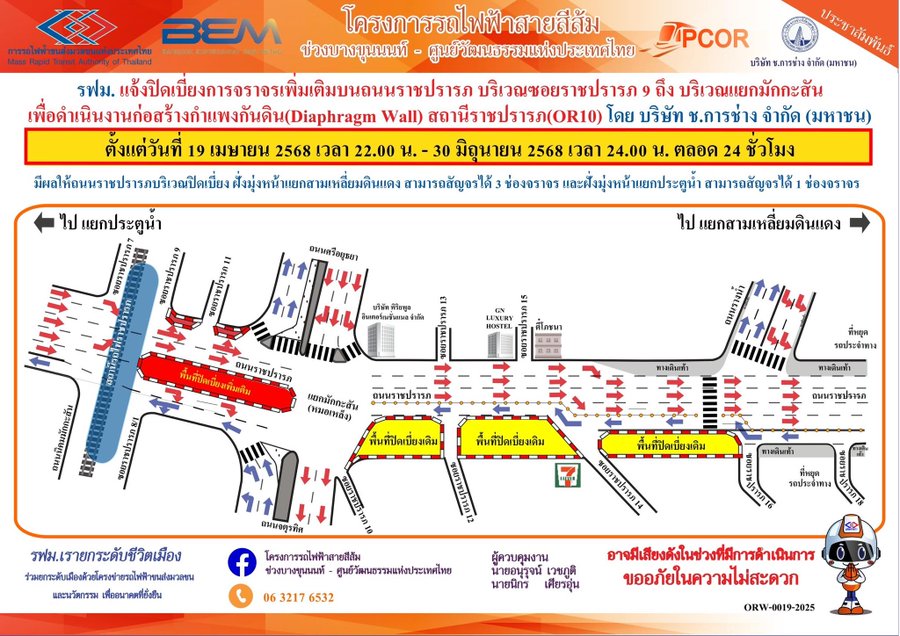 หมายเหตุ รฟม. แจ้งปิดเบี่ยงจราจรเพิ่มเติมบนถนนราชปรารภบริเวณซอยราชปรารภ9 ถึง บริเวณแยกมักกะสัน เพื่อดำเนินงานก่อสร้างกำแพงกันดิน (Diaphragm Wall) สถานีราชปรารภ (OR10) โครงการรถไฟฟ้าสายสีส้ม ช่วงบางขุนนนท์ – ศูนย์วัฒนธรรมแห่งประเทศไทย ตั้งแต่วันที่ 19 เมษายน 2568 เวลา 22.00 น. - 30 มิถุนายน 2568 เวลา 24.00 น. ตลอด 24 ชั่วโมง โดยมีรายละเอียดการปิดเบี่ยงจราจร ดังนี้