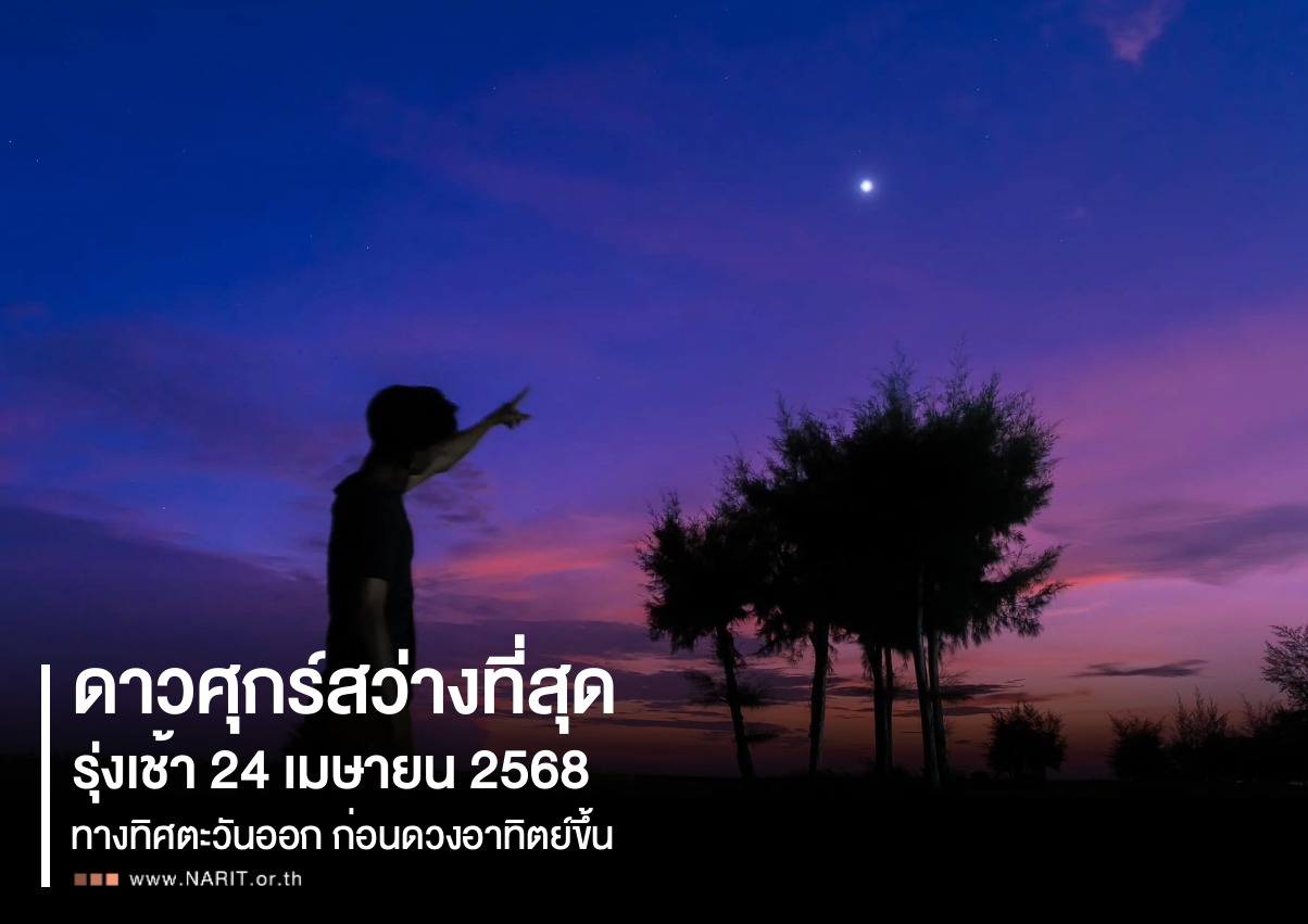 ในวันที่ 24 เมษายน 2568 “ดาวศุกร์” จะปรากฏสว่างที่สุดเป็นครั้งสุดท้ายในรอบปีนี้ เห็นชัดด้วยตาเปล่าทางทิศตะวันออก ตั้งแต่เวลาประมาณ 04:00 น. เป็นต้นไป จนกระทั่งดวงอาทิตย์ขึ้นจากขอบฟ้า หากดูผ่านกล้องโทรทรรศน์จะเห็นดาวศุกร์ปรากฏเป็นเสี้ยวคล้ายดวงจันทร์ นอกจากนี้ ในช่วงเวลาดังกล่าวยังสามารถสังเกตเห็นดาวเสาร์ปรากฏถัดลงมาใกล้ขอบฟ้า อีกทั้งยังมีดวงจันทร์เสี้ยวปรากฏสว่างถัดขึ้นไปอีกด้วย หากทัศนวิสัยท้องฟ้าดีสามารถชมความสวยงามของดาวศุกร์และวัตถุท้องฟ้าต่าง ๆ ได้ด้วยตาเปล่าอย่างชัดเจน