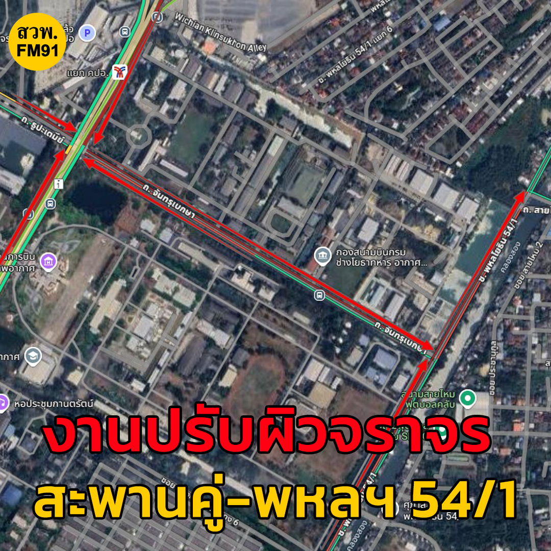 21 เม.ย. 68 เวลา 20.00 น. งานปรับผิวจราจร ซอยพหลโยธิน 54/1 ก่อนเลี้ยวเข้าถนนสายไหม ดำเนินการในช่องจราจรที่ 3 ติดต่อเนื่อง ถ.จันทรุเบกษา แยกค.ป.อ.