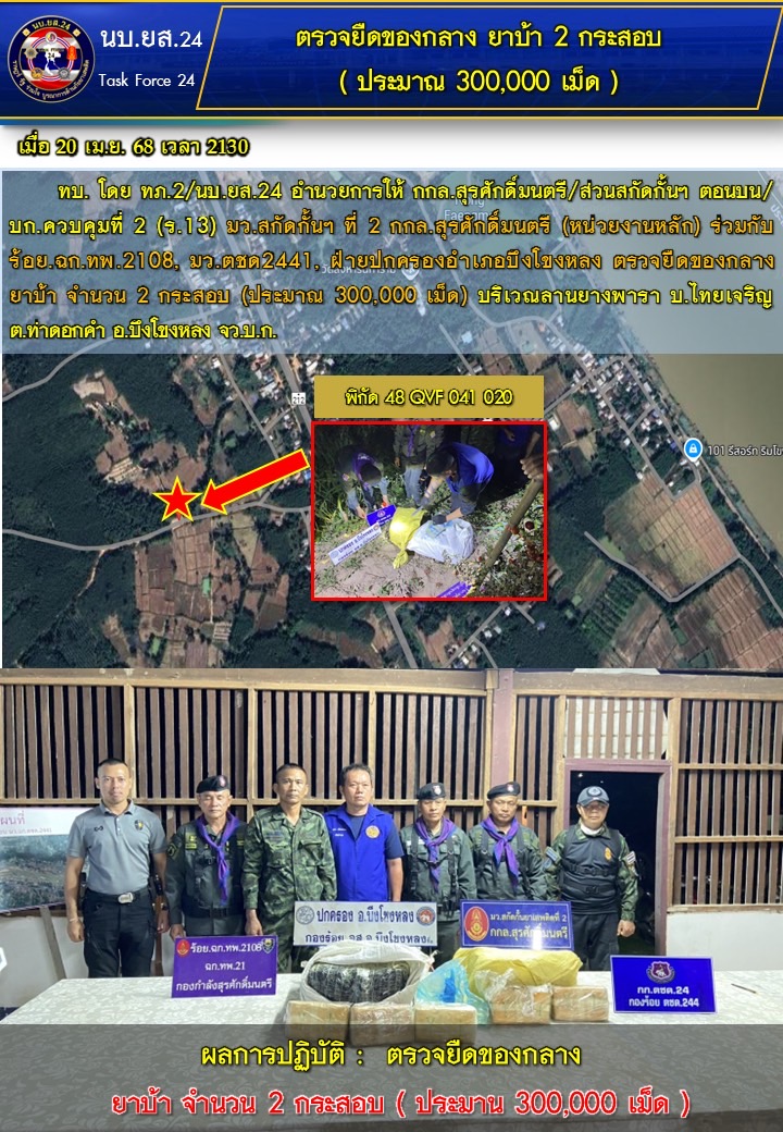 โดยล่าสุด ทางกองกำลังสุรศักดิ์มนตรี (กกล. สุรศักดิ์มนตรี) ในฐานะส่วนสกัดกั้นยาเสพติด และสิ่งผิดหมายตอนบน บก.ควบคุมที่ 2 กรมทหารราบที่ 13 (ร.13) มว.สกัดกั้นที่ 2 กกล.สุรศักดิ์มนตรี (หน่วยงานหลัก) บูรณาการร่วมกับ ร้อย.ฉก.ทพ.2108, มว.ตชด.2441 และ ฝ่ายปกครองอำเภอบึงโขงหลง ได้รับรายงานจากแหล่งข่าว ว่าจะมีการลำเลียงยาเสพติดข้ามมาจากประเทศเพื่อนบ้าน เข้าสู่พื้นที่ตอนใน บริเวณลานยางพารา บ.ไทยเจริญ ต.ท่าดอกคำ อ.บึงโขงหลง จ. บึงกาฬ มว.สกัดกั้นที่ 2 ทางเจ้าหน้าที่จึงได้บูรณาการทำการวางกำลัง บริเวณลานซื้อขายยางพารา ตามที่ได้รับแจ้งข่าว กระทั้งได้มีรถจักรยานยนต์ ไม่ติดแผนป้ายทะเบียน ขับเข้ามาบริเวณลานยางพาราและมีคนเดินเข้ามาบริเวณหลังห้องน้ำ หยิบกระสอบสีขาว 1 กระสอบ และสีเหลือง 1 กระสอบ เจ้าหน้าที่ที่ทำการซุ่มอยู่บริเวณใกล้เคียง จึงได้แสดงตัวขอตรวจค้นกลุ่มคนดังกล่าว เมื่อเห็นเจ้าหน้าที่ดังกว่าจึ่งได้วิ่งไปขับจักรยานยนต์ ที่จอดอยู่ใหล้เคียงขับหลบหนีไป