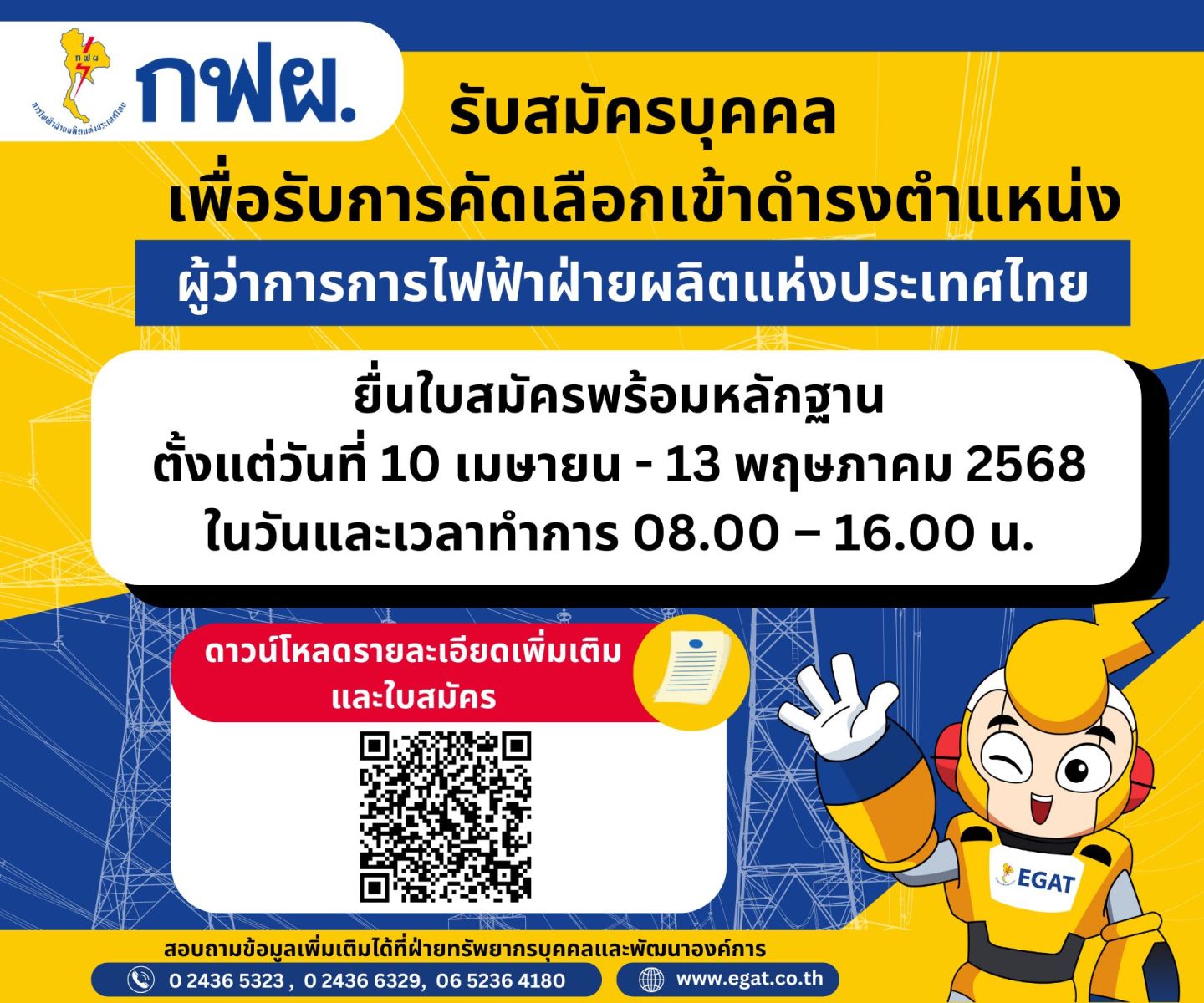 ประกาศรับสมัครบุคคลเพื่อรับการคัดเลือกเข้าดำรงตำแหน่ง“ผู้ว่าการการไฟฟ้าฝ่ายผลิตแห่งประเทศไทย” ยื่นใบสมัครพร้อมหลักฐานด้วยตนเอง ตั้งแต่วันที่ 10 เมษายน – 13 พฤษภาคม 2568 ในวันและเวลาทำการ 08.00 – 16.00 น.