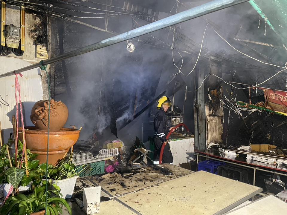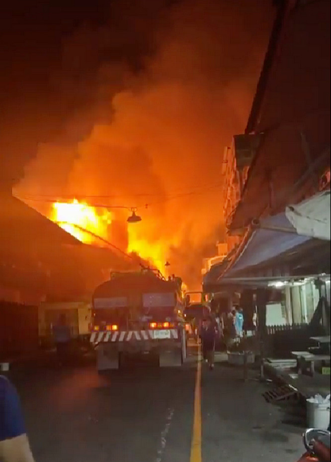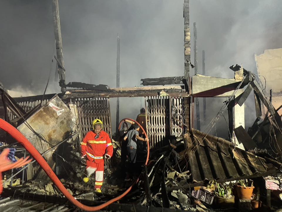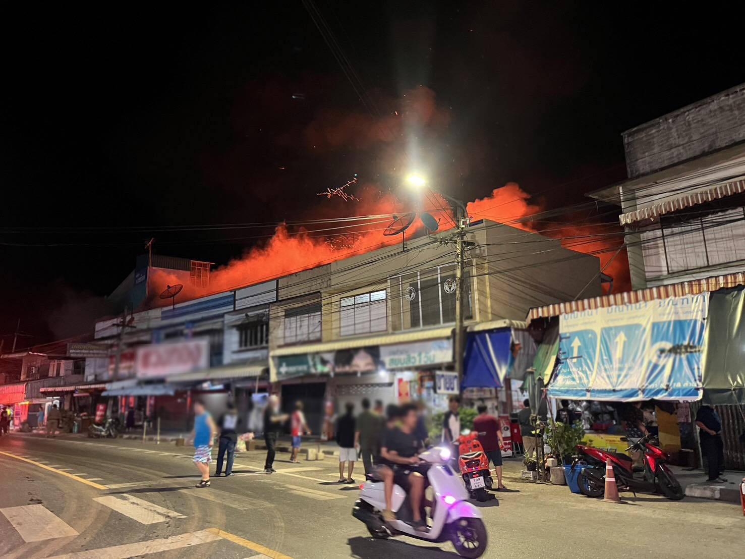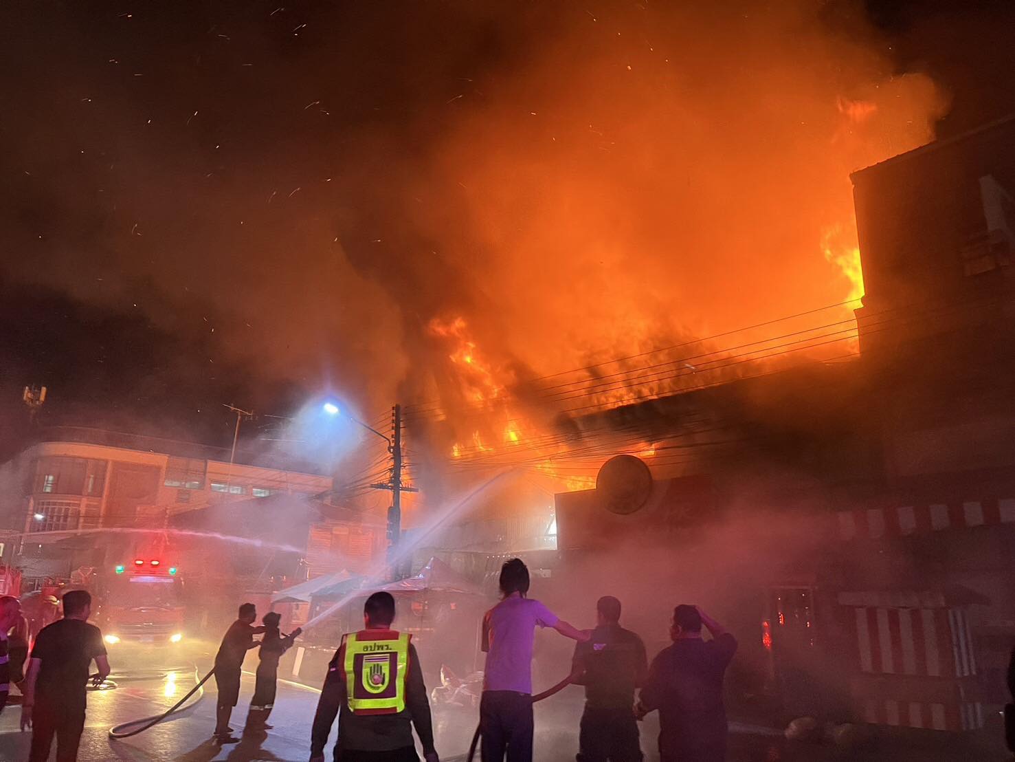ที่เกิดเหตุ ลักษณะเป็นอาคารครึ่งปูนครึ่งไม้ที่ปลูกติดกันหลายคูหา เพลิงกำลังโหมลุกไหม้รุนแรง เจ้าหน้าที่พร้อมด้วยรถดับเพลิงจำนวนหลายคัน อยู่ระหว่างการใช้หัวฉีดน้ำ ยังไม่สามารถควบคุมได้