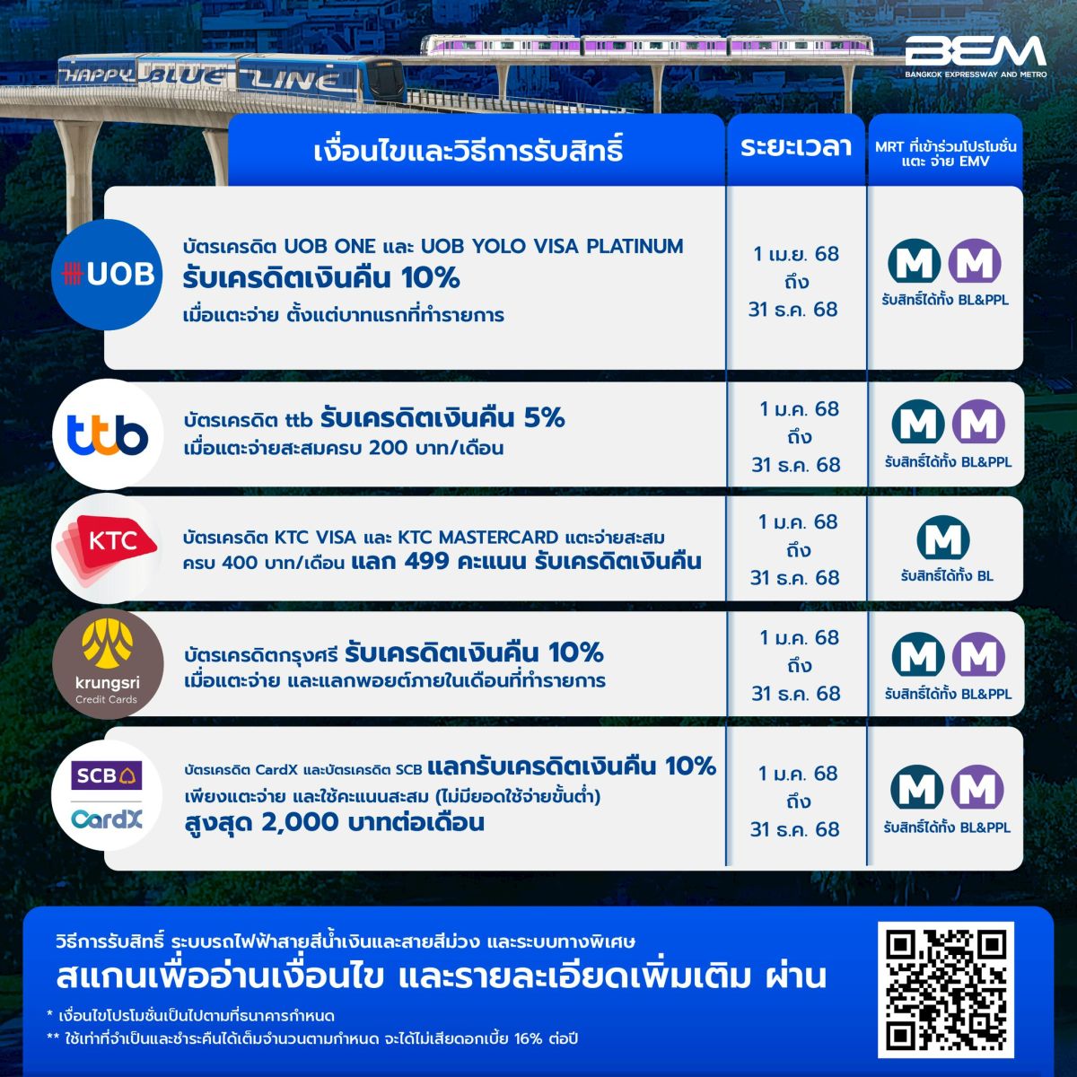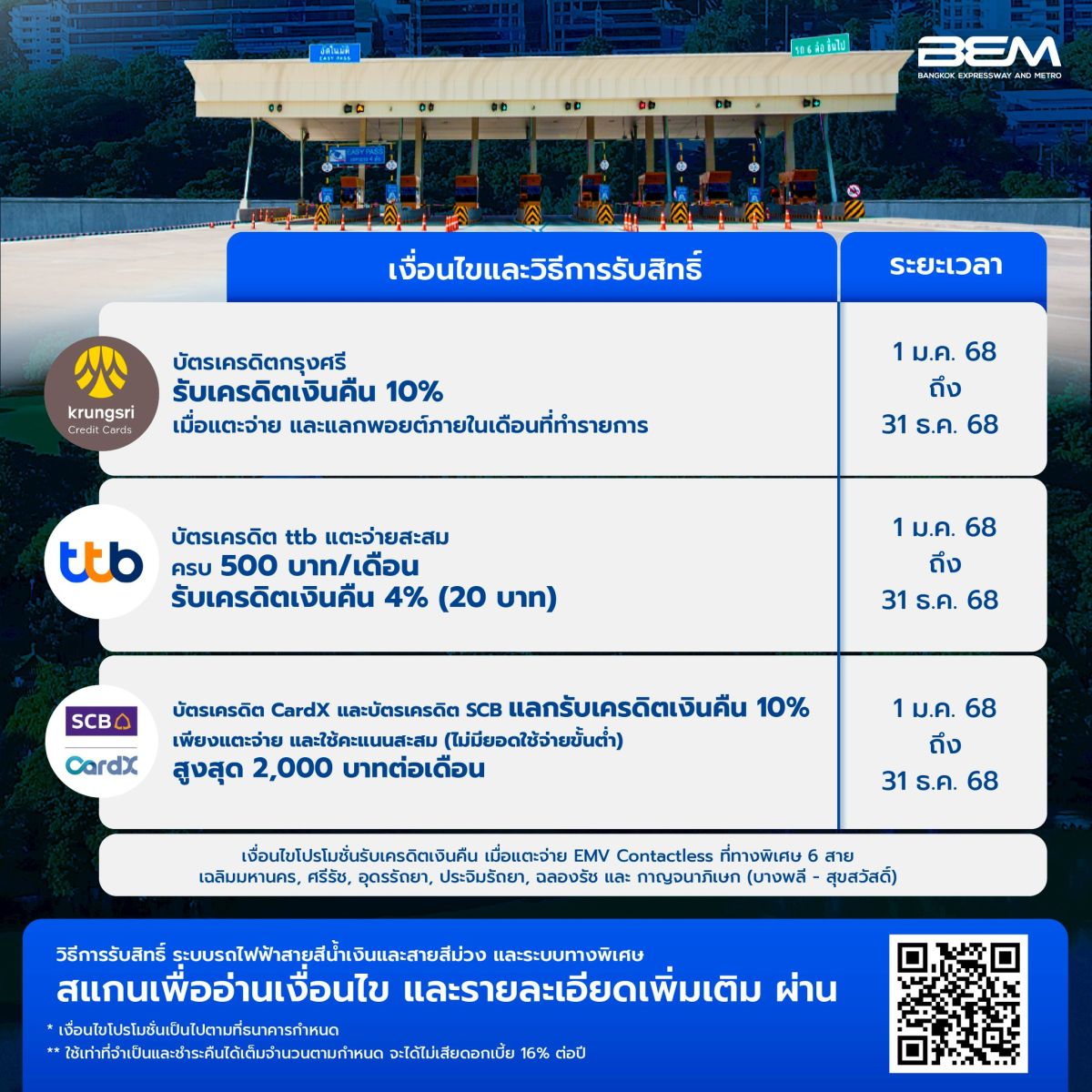 ด้วยเทคโนโลยี EMV ที่ระยะหลังเป็นที่นิยมของผู้ถือบัตรเครดิต เพราะสามารถแตะจ่ายได้อย่างสะดวกรวดเร็วทุกการเดินทาง โดยเฉพาะรถไฟฟ้า MRT สายสีน้ำเงินและสายสีม่วง รวมถึงทางพิเศษซึ่งปัจจุบันเปิดให้บริการแตะจ่ายค่าผ่านทางได้ถึง 6 สายทาง ได้แก่ ทางพิเศษเฉลิมมหานคร, ศรีรัช, อุดรรัถยา, ประจิมรัถยา, ฉลองรัช และกาญจนาภิเษก (บางพลี-สุขสวัสดิ์) บริษัท ทางด่วนและรถไฟฟ้ากรุงเทพ จำกัด (มหาชน) หรือ BEM รวบรวมโปรโมชั่นบัตรเครดิต ฉบับอัพเดตประจำปี 2568 รับเครดิตเงินคืนสูงสุด 10% และสิทธิประโยชน์อีกมากมาย คุ้มค่าการเดินทางเป็นอย่างมาก