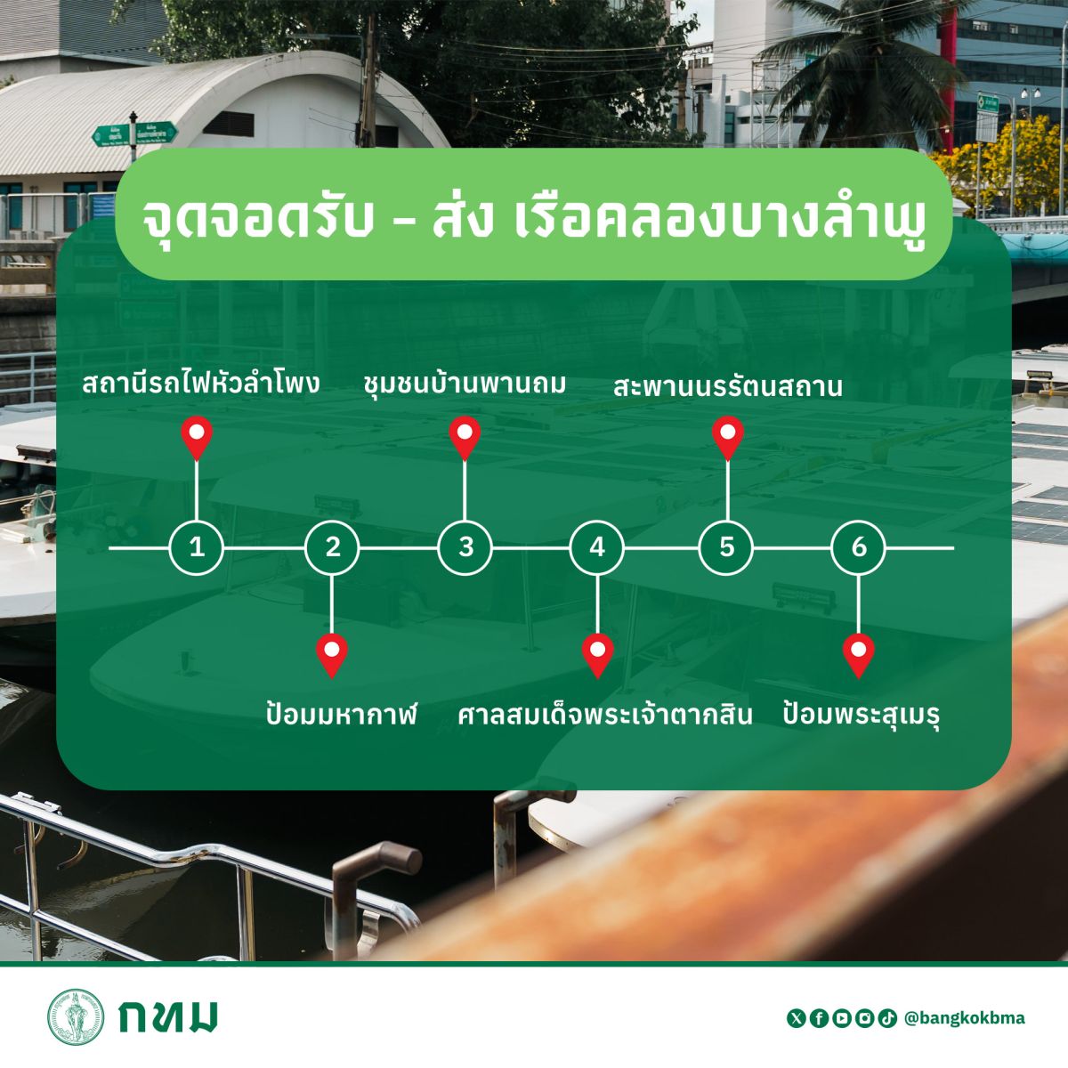 เส้นทางล่องเรือจะผ่านทั้งหมด 6 จุดจอดหลัก ดังนี้