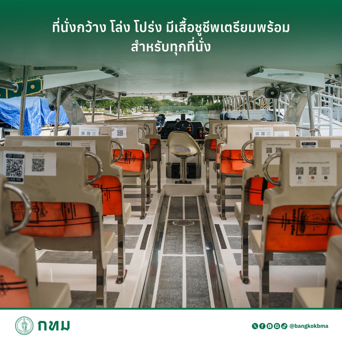 ล่องสบายด้วยเรือไฟฟ้าพลังงานแสงอาทิตย์ เรือที่ให้บริการเป็นเรือไฟฟ้าพลังงานแสงอาทิตย์ เสียงเงียบ ไร้มลพิษ ที่นั่งกว้าง โล่ง โปร่ง พร้อมเสื้อชูชีพสำหรับทุกที่นั่ง ปลอดภัยทุกการเดินทาง