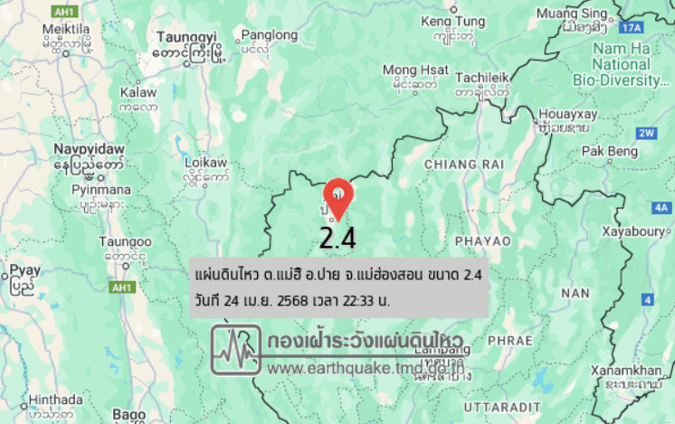 วันที่ 24 เม.ย. 2568 เวลา 22.33 น. กองเฝ้าระวังแผ่นดินไหว กรมอุตุนิยมวิทยา แจ้งเหตุแผ่นดินไหว ขนาด 2.4 ความลึก 1 กม. ภายในพื้นที่ของ ต.แม่ฮี้ อ.ปาย จ.แม่ฮ่องสอน (19.33°N,98.50°E) ขณะนี้ยังไม่มีรายงานการรับรู้ถึงแรงสั่นสะเทือน