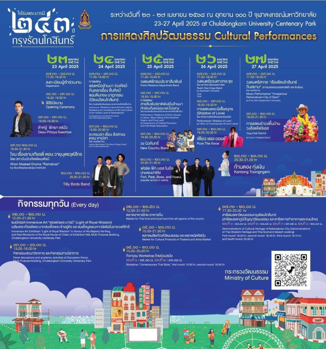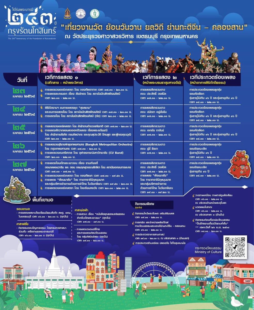 นางสาวสุดาวรรณ หวังศุภกิจโกศล รมว.วธ. เปิดเผยว่า ตามที่กระทรวงวัฒนธรรม ร่วมกับหน่วยงาน เครือข่าย จัด "งานใต้ร่มพระบารมี 243 ปี กรุงรัตนโกสินทร์" ระหว่างวันที่ 23 -27 เมษายน 2568 ใน 3 พื้นที่ของกรุงเทพมหานคร ได้แก่ อุทยาน 100 ปีจุฬาลงกรณ์มหาวิทยาลัย พิพิธภัณฑสถานแห่งชาติ พระนคร และวัดประยุรวงศาวาสวรวิหาร โดยมีพิธีเปิดงานไปแล้วเมื่อวันที่ 23 เมษายน 2568 ได้รับรายงานว่าตลอด 3 วัน ที่ผ่านมามีผู้สนใจเข้าชมงานเป็นจำนวนมากทั้ง 3 พื้นที่ ผู้ชมงานมีทุกกลุ่ม และทุกช่วงวัย เช่น เด็ก เยาวชน คนรุ่นใหม่ ผู้ใหญ่ ผู้สูงอายุ เป็นการเข้าชมงานของคนทุกกลุ่มวัย มีทั้งชาวไทย และชาวต่างชาติ การจัดงานฯ ครั้งนี้ ได้รับกระแสตอบรับที่ดีจากนักท่องเที่ยว และผู้ชมงานเป็นจำนวนมาก จึงขอเชิญชวนทุกท่านที่ยังไม่ได้มาชมงาน ยังเหลือเวลาอีก 2 วัน ที่สามารถมาชมงานได้ คือวันที่ 26 - 27 เมษายน 2568 โดยมีไฮไลท์สำคัญของงานในแต่ละพื้นที่ ดังนี้