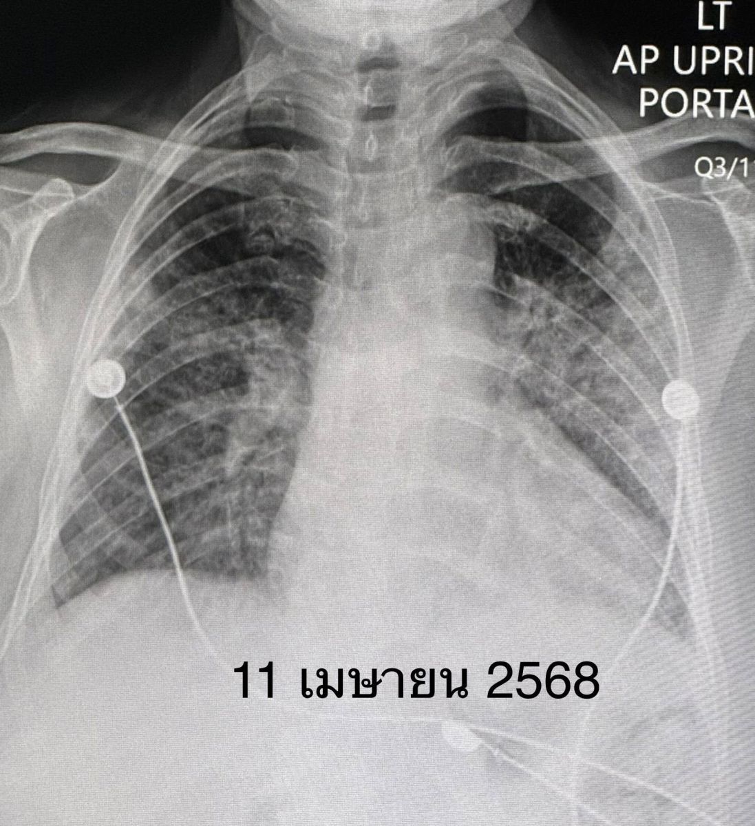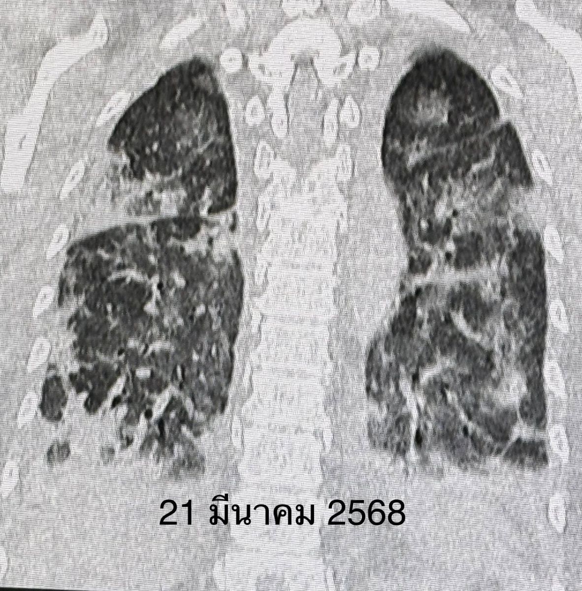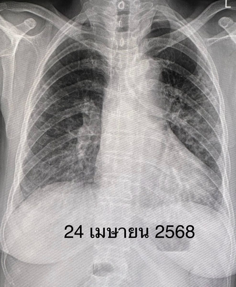 จนเริ่มเข้าโรงพยาบาลใกล้บ้านวันที่ 16 มี.ค.68 เพราะเหนื่อยมากขึ้นจนลุกขึ้นยืนไม่ได้ ไม่มีไข้ ผิวหนังปกติ กล้ามเนื้อไม่อ่อนแรง แต่ระดับออกซิเจนที่ปลายนิ้วต่ำมาก จนต้องให้ออกซิเจนชนิดอัตราการไหลสูงทางจมูก High-Flow nasal O2 cannula เจาะเลือด พบเลือดจางเล็กน้อย ค่าอักเสบในเลือด ESR และ hs-CRP สูง, ANA ปกติ ค่าโซเดียมในเลือดต่ำ เอกซเรย์ปอดและคอมพิวเตอร์ปอดพบปอดอักเสบทั้ง 2 ข้าง แยงจมูก ส่งเลือดเพาะเชื้อ ส่องกล้องเข้าไปในหลอดลม ไม่พบการติดเชื้อแบคทีเรีย ไวรัส เชื้อรา หรือวัณโรค ได้ยาปฏิชีวนะ เอกซเรย์ปอดไม่ดีขึ้น หลังรักษารพ.ใกล้บ้านมา 26 วัน ญาติขอย้ายมารักษาต่อวันที่ 11 เม.ย.68