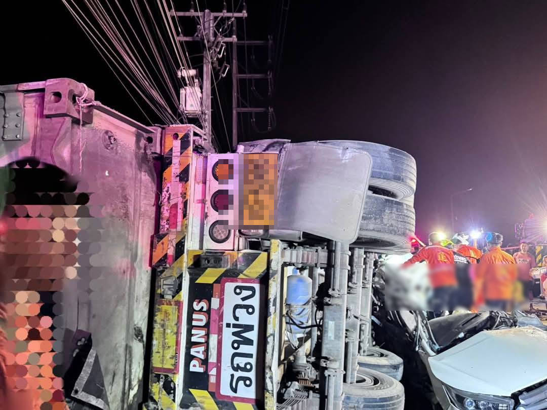 ที่เกิดเหตุ พบรถนั่งส่วนบุคคล สีขาว ป้ายทะเบียน 5726 กทม. สภาพถูกชนอัดก็อปปี้ระหว่างรถบรรทุก ป้ายทะเบียน 5589 ระยอง และรถบรรทุก 5685 ชุมพร ที่พลิกตะแคง