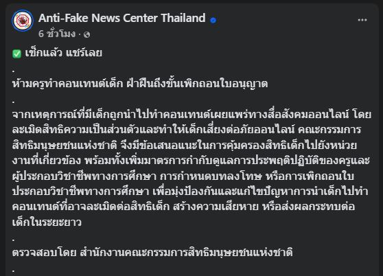 วันที่ 30 เมษายน 2568 ผู้สื่อข่าวรายงานว่า ทางเพจ Anti-Fake News Center Thailand ได้โพสต์ข้อความระบุว่า "เช็กแล้ว แชร์เลย ห้ามครูทำคอนเทนต์เด็ก ฝ่าฝืนถึงขั้นเพิกถอนใบอนุญาต จากเหตุการณ์ที่มีเด็กถูกนำไปทำคอนเทนต์เผยแพร่ทางสื่อสังคมออนไลน์ โดยละเมิดสิทธิความเป็นส่วนตัวและทำให้เด็กเสี่ยงต่อภัยออนไลน์ คณะกรรมการสิทธิมนุษยชนแห่งชาติ จึงมีข้อเสนอแนะในการคุ้มครองสิทธิเด็กไปยังหน่วยงานที่เกี่ยวข้อง พร้อมทั้งเพิ่มมาตรการกำกับดูแลการประพฤติปฏิบัติของครูและผู้ประกอบวิชาชีพทางการศึกษา การกำหนดบทลงโทษ หรือการเพิกถอนใบประกอบวิชาชีพทางการศึกษา เพื่อมุ่งป้องกันและแก้ไขปัญหาการนำเด็กไปทำคอนเทนต์ที่อาจละเมิดต่อสิทธิเด็ก สร้างความเสียหาย หรือส่งผลกระทบต่อเด็กในระยะยาว ตรวจสอบโดย สำนักงานคณะกรรมการสิทธิมนุษยชนแห่งชาติ"