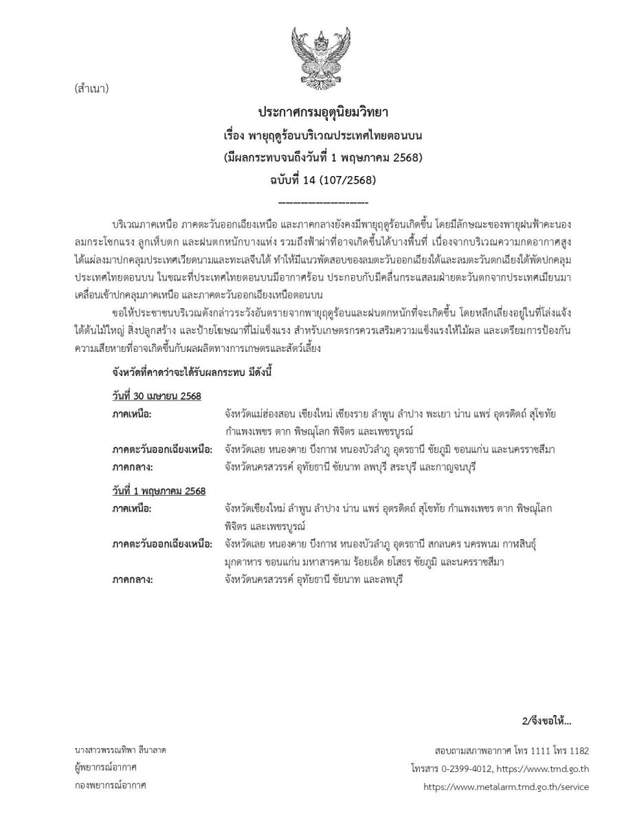 ประกาศกรมอุตุนิยมวิทยา เรื่อง พายุฤดูร้อนบริเวณประเทศไทยตอนบน (มีผลกระทบจนถึงวันที่ 1 พฤษภาคม 2568) ฉบับที่ 14 (107/2568) บริเวณภาคเหนือ ภาคตะวันออกเฉียงเหนือ และภาคกลางยังคงมีพายุฤดูร้อนเกิดขึ้น โดยมีลักษณะของพายุฝนฟ้าคะนอง ลมกระโชกแรง ลูกเห็บตก และฝนตกหนักบางแห่ง รวมถึงฟ้าผ่าที่อาจเกิดขึ้นได้บางพื้นที่ เนื่องจากบริเวณความกดอากาศสูง ได้แผ่ลงมาปกคลุมประเทศเวียดนามและ ทะเลจีนใต้ ทำให้มีแนวพัดสอบของลมตะวันออกเฉียงใต้และลมตะวันตกเฉียงใต้พัดปกคลุม ประเทศไทยตอนบน ในขณะที่ประเทศไทยตอนบนมีอากาศร้อน ประกอบกับมีคลื่นกระแสลมฝ่ายตะวันตกจากประเทศเมียนมา เคลื่อนเข้าปกคลุมภาคเหนือ และภาคตะวันออกเฉียงเหนือตอนบน ขอให้ประชาชนบริเวณดังกล่าวระวังอันตรายจากพายุฤดูร้อนและฝนตกหนักที่จะเกิดขึ้น โดยหลีกเลี่ยงอยู่ในที่โล่งแจ้ง ใต้ต้นไม้ใหญ่ สิ่งปลูกสร้าง และป้ายโฆษณาที่ไม่แข็งแรง สำหรับเกษตรกรควรเสริมความแข็งแรงให้ไม้ผล และเตรียมการป้องกันความเสียหายที่อาจเกิดขึ้นกับผลผลิตทางการเกษตรและสัตว์เลี้ยง จังหวัดที่คาดว่าจะได้รับผลกระทบ มีดังนี้