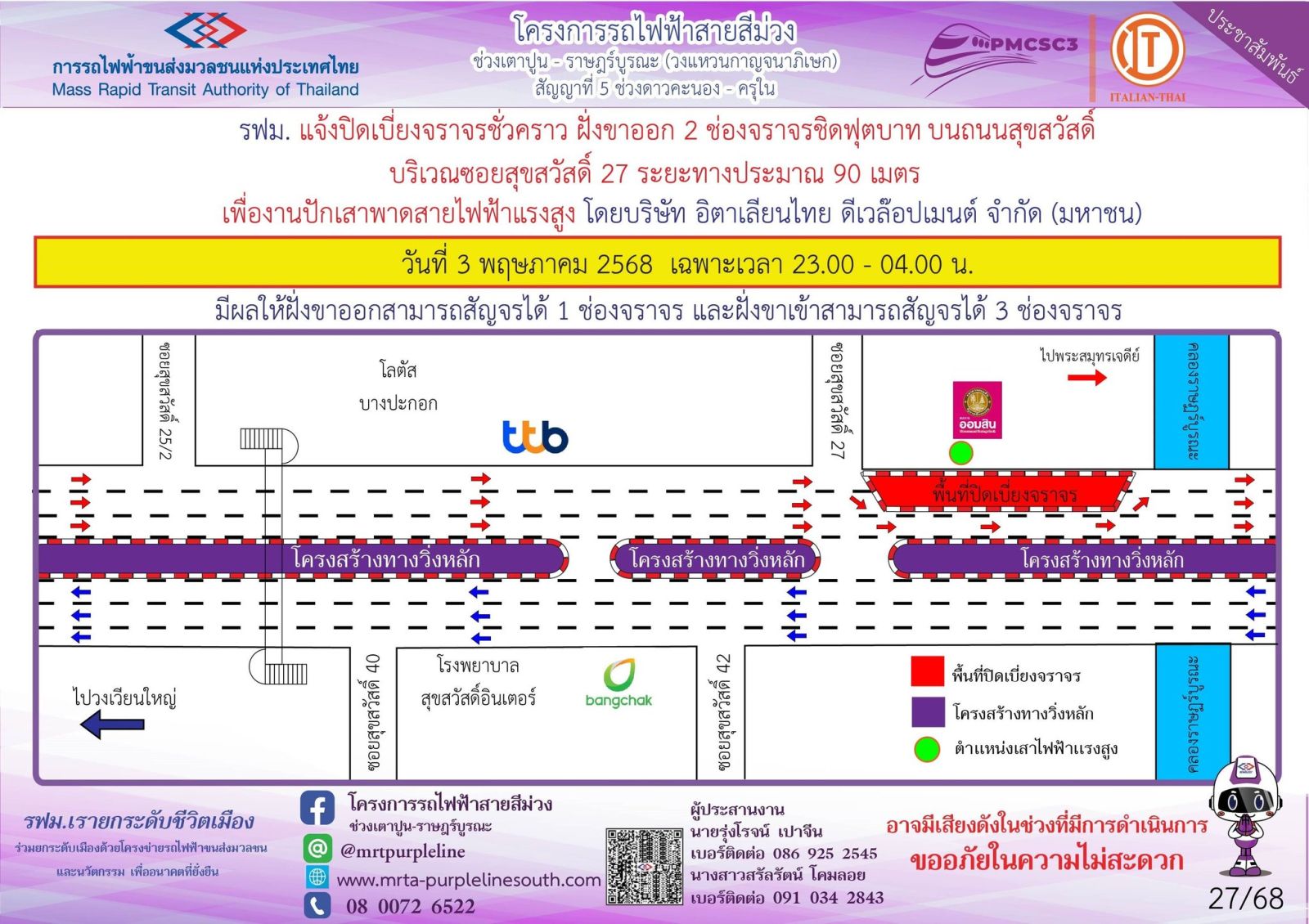 การรถไฟฟ้าขนส่งมวลชนแห่งประเทศไทย (รฟม.) แจ้งว่า บริษัท อิตาเลียนไทย ดีเวล๊อปเมนต์ จำกัด (มหาชน) ผู้รับจ้างงานก่อสร้างทางวิ่งและสถานียกระดับ อาคารจอดรถไฟฟ้าและอาคารจอดแล้วจร โครงการรถไฟฟ้าสายสีม่วง ช่วงเตาปูน - ราษฎร์บูรณะ (วงแหวนกาญจนาภิเษก) สัญญาที่ 5 ช่วงดาวคะนอง - ครุใน มีความจำเป็นต้องปิดเบี่ยงจราจรชั่วคราว ฝั่งขาออก 2 ช่องจราจร ชิดฟุตบาท บนถนนสุขสวัสดิ์ บริเวณซอยสุขสวัสดิ์ 27 ระยะทางประมาณ 90 เมตร เพื่องานปักเสาพาดสายไฟฟ้าแรงสูง ในวันที่ 3 พฤษภาคม 2568 เฉพาะเวลา 23.00 – 04.00 น. มีผลให้ฝั่งขาออกสามารถสัญจรได้ 1 ช่องจราจร และฝั่งขาเข้าสามารถสัญจรได้ 3 ช่องจราจร