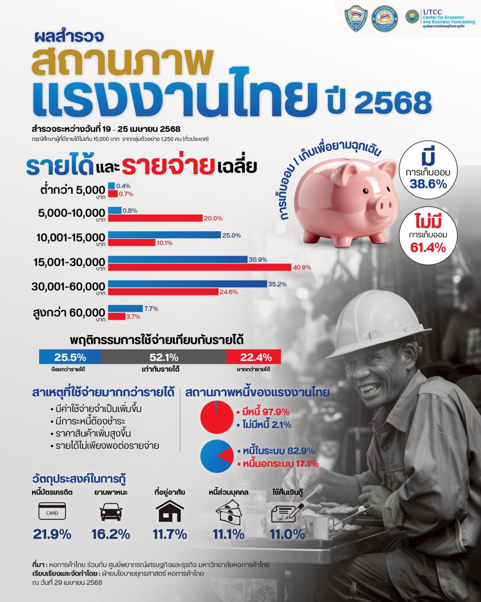 ม.หอการค้าไทย เผยผลสำรวจ สถานภาพแรงงานไทย 98.8% มีหนี้สินมากกว่ารายได้ แรงงานร้องค่าจ้างไม่เหมาะสมยุคของแพง-หนี้ท่วม