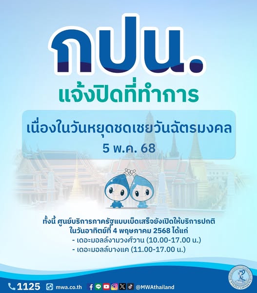 กปน. แจ้งปิดที่ทำการเนื่องในวันหยุดชดเชยวันฉัตรมงคล พร้อมแนะช่องทางใช้บริการสะดวกได้ตลอดวัน