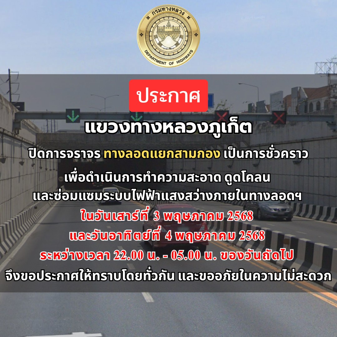 ปิดการจราจร "ทางลอดแยกสามกอง" ถนนเฉลิมพระเกียรติ รัชกาลที่ 9 ในพื้นที่อำเภอกะทู้ จังหวัดภูเก็ต ชั่วคราว ระหว่างเวลา 22.00 น.- 05.00 น. ของวันถัดไป