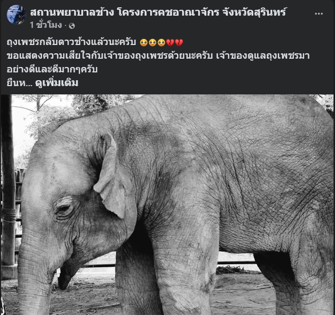 3 พฤษภาคม 2568 เพจ "สถานพยาบาลช้าง โครงการคชอาณาจักร จังหวัดสุรินทร์" โพสต์ภาพและข้อความระบุว่า "ถุงเพชรกลับดาวช้างแล้วนะครับ ขอแสดงความเสียใจกับเจ้าของถุงเพชรด้วยนะครับ เจ้าของดูแลถุงเพชรมาอย่างดีและดีมากๆครับ ยืนหยัดสู้ร่วมกับทีมหมอไม่ห่างไปไหน จากเคสของถุงเพชร ทาง สถานพยาบาลช้าง โครงการคชอาณาจักร จังหวัดสุรินทร์ และ สถาบันวิจัยและบริการสุขภาพช้างแห่งชาติ ขอขอบคุณ โรงพยาบาลช้าง ศูนย์อนุรักษ์ช้างไทย Elephant Hospital, TECC และ หน่วยสัตว์ป่า ม.เกษตรศาสตร์ กำแพงแสน – Wildlife Unit, Kasetsart University ที่ให้คำปรึกษาแบบไม่ได้หลับได้นอนและส่งยาต้านไวรัส เวชภัณฑ์สำหรับการรักษาโรงพยาบาลสุรินทร์ สำหรับถุงเก็บเลือด ขอบคุณมากๆสำหรับช้างที่ต้องการบริจาคเลือด พลายอินทนนท์ พลายสตางค์ พลายป๋อง พลายโจ้ พังถุงทอง และเชือกอื่นๆที่ทักมา
