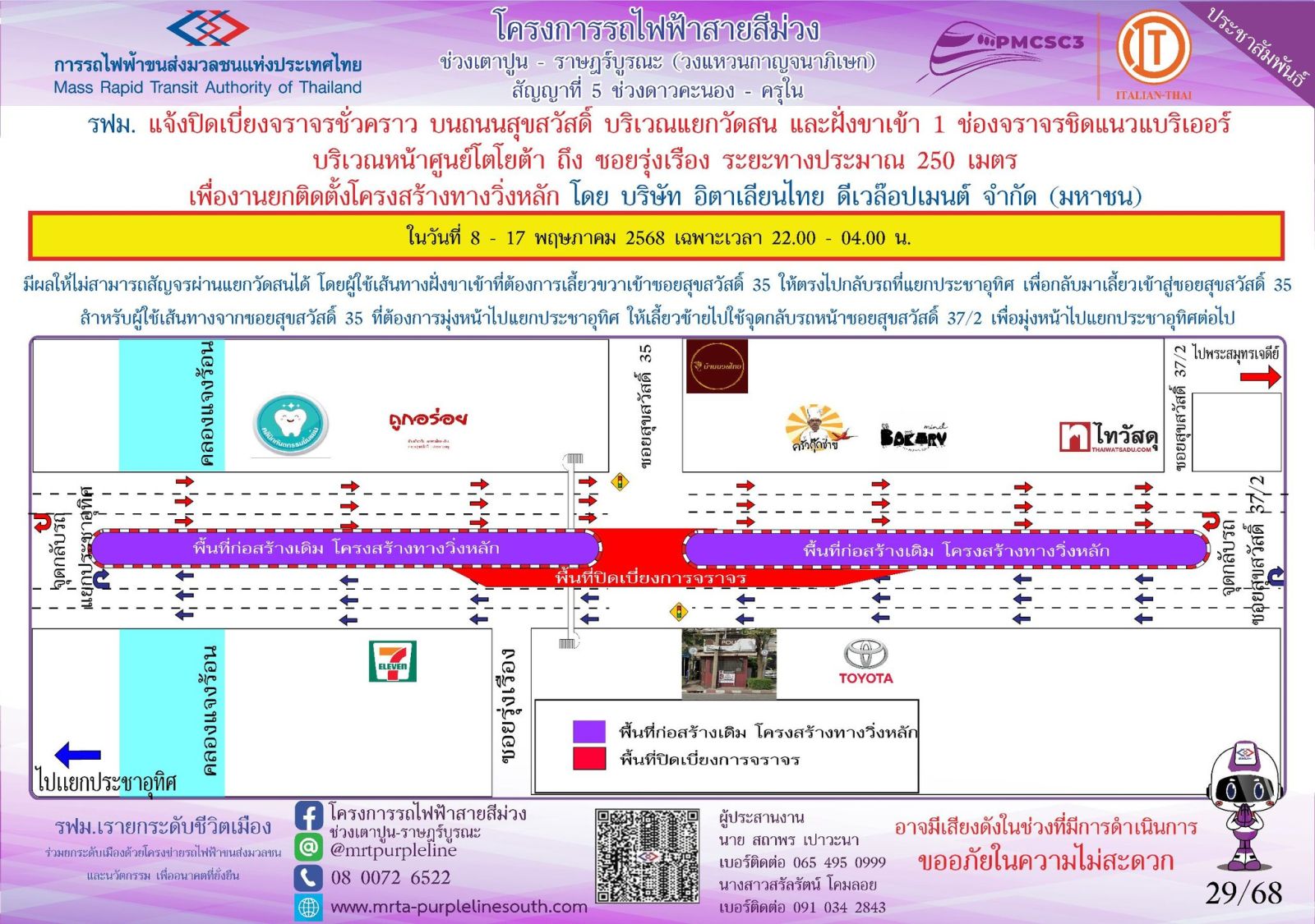 ทั้งนี้ การปิดเบี่ยงจราจรเพื่อดำเนินงานดังกล่าว อาจทำให้ผู้ใช้เส้นทางไม่ได้รับความสะดวกในการเดินทางและอาจมีเสียงดังรบกวนพื้นที่บริเวณใกล้เคียงในวันเวลาดังกล่าว ดังนั้น หากไม่มีความจำเป็นโปรดหลีกเลี่ยงเส้นทาง และ รฟม. ต้องขออภัยมา ณ โอกาสนี้ โดยผู้ใช้เส้นทางสามารถสอบถามรายละเอียดการปิดเบี่ยงจราจรได้ที่หมายเลข 08 0072 6522 และติดตามข้อมูลโครงการฯ ได้ที่ เว็บไซต์ www.mrta-purplelinesouth.com Facebook โครงการรถไฟฟ้าสายสีม่วง ช่วงเตาปูน – ราษฎร์บูรณะ และ Line @mrtpurpleline