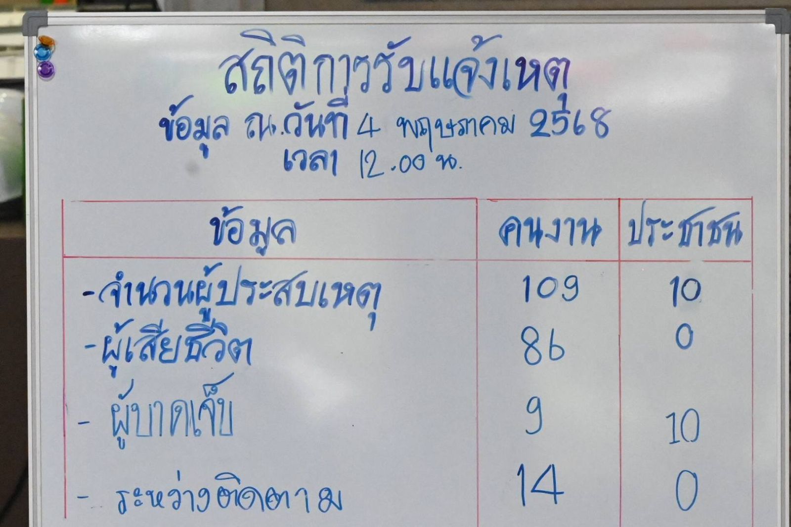 กองอำนวยการร่วมจึงขอทำการปรับเปลี่ยนพร้อมประกาศผ่านสื่อมวลชน เพื่อให้เข้าใจตรงกัน ว่า ณ วันที่ 4 พฤษภาคม 2568 เวลา 12.00 น. จำนวนผู้ประสบเหตุเพิ่มขึ้นเป็น 109 รายจากเดิม 103 ราย โดยยืนยันผู้เสียชีวิต 86 ราย ผู้บาดเจ็บ คงที่ 9 ราย และอยู่ระหว่างการติดตามอีก 14 ราย จากเดิม 8 ราย