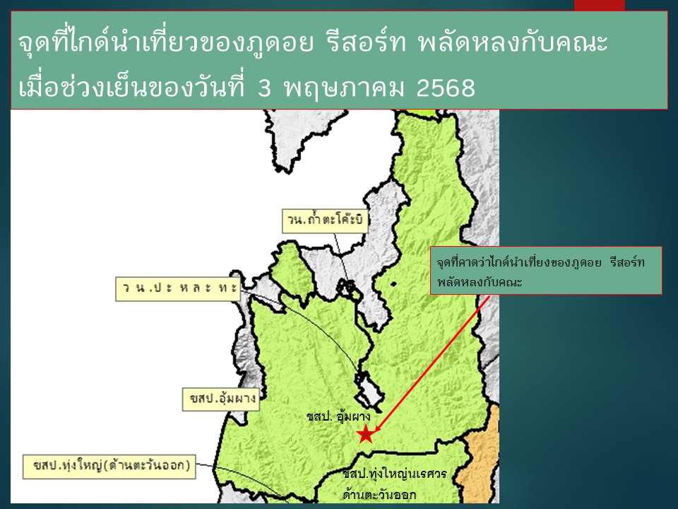เมื่อวันที่ 5 พฤษภาคม 2568 .นายปิยะ ภิญโญ หัวหน้าเขตรักษาพันธุ์สัตว์ป่าอุ้มผาง อ.อุ้มผาง จ.ตาก แจ้งว่าเขตรักษาพันธุ์สัตว์ป่าอุ้มผางได้รับรายงานจากหัวหน้าหน่วยพิทักษ์ป่าห้วยพลู ว่ามีผู้ประกอบการท่องเที่ยวในท้องที่อำเภออุ้มผาง (ภูดอย รีสอร์ท) ว่ามีไกด์นำเที่ยวของภูดอย รีสอร์ท จำนวน 1 คน เป็นชาย ได้พลัดหลงกับคณะไกด์และนักท่องเที่ยว บริเวณดอยพะลาเต ในพื้นที่เขตรักษาพันธุ์สัตว์ป่าอุ้มผาง เมื่อช่วงเย็นของวันที่ 3 พฤษภาคม 2568 ที่ผ่านมา โดยได้ขออนุญาตเข้าไปเพื่อศึกษาธรรมชาติกับเจ้าหน้าที่แล้ว ซึ่งทางรีสอร์ทภูดอย ได้ติดต่อทางโทรศัพท์กับไกด์นำเที่ยวที่พลัดหลงดังกล่าว ซึ่งได้นัดหมายจุดที่จะเข้าไปรับในช่วงเช้าของวันที่ 4 พฤษภาคม 2568 จากนั้นในวันที่ 4 พฤษภาคม 2568 เจ้าหน้าที่ภูดอย รีสอร์ทจึงเข้าไปรับไกด์นำเที่ยวที่พลัดหลงดังกล่าว แต่ไม่พบตัว และไม่สามารถติดต่อทางโทรศัพท์ได้ จากนั้นจึงได้ประสานเจ้าหน้าที่เขตรักษาพันธุ์สัตว์ป่าอุ้มผาง และกำนันตำบลแม่ละมุ้ง และชาวบ้านเพื่อช่วยค้นหาไกด์นำเที่ยวที่พลัดหลงดังกล่าว