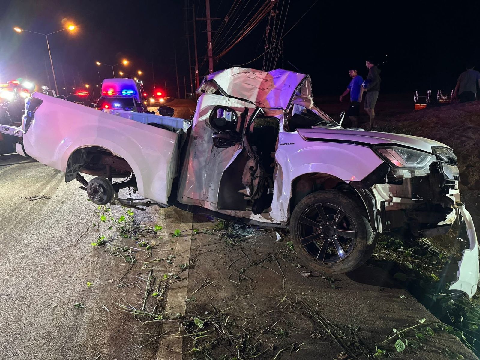 รถกระบะ เสียหลักฟาดเสาไฟฟ้าข้างทาง ริมถนนหมายเลข 324 มีผู้เสียชีวิต 3 ราย จ.กาญจนบุรี
