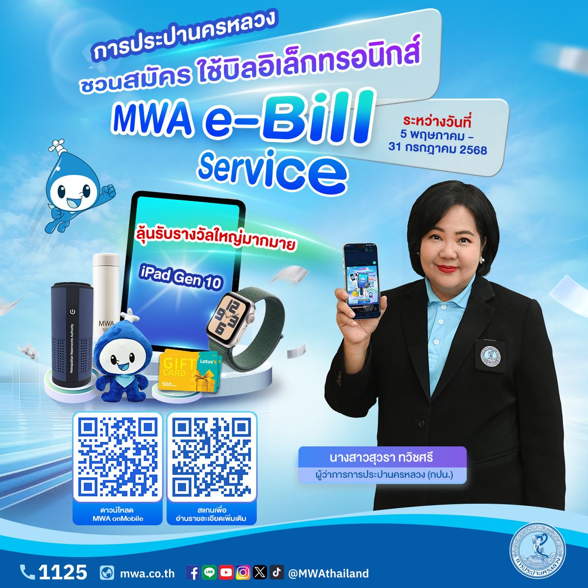 กปน. ได้จัดแคมเปญพิเศษเชิญชวนลูกค้าสมัครใช้บริการ MWA e-Bill Service ผ่านแอปพลิเคชัน MWA onMobile โดยกดจากแบนเนอร์ประชาสัมพันธ์กิจกรรมในแอปฯ ระหว่างวันที่ 5 พฤษภาคม – 31 กรกฎาคม 2568 มีสิทธิ์ลุ้นรับของรางวัล อาทิ iPad Gen 10 นาฬิกา Apple Watch SE บัตรกำนัลเงินสด และของรางวัลอื่น ๆ อีกมากมาย
