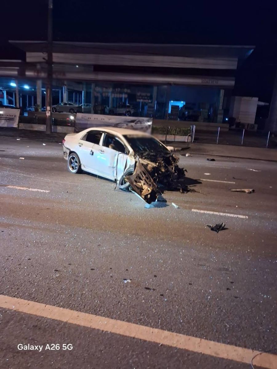 ที่เกิดเหตุ พบรถยนต์นั่งส่วนบุคคล โตโยต้า สีขาว ป้ายทะเบียน สุราษฏร์ธานี ลักษณะชนกับเสาเหล็กป้ายสัญญาณบอกเส้นทาง สภาพหน้ารถพังเสียหาย และห่างออกไปพบว่ามีผู้บาดเจ็บ ชาย 1 ราย สภาพร่างกระเด็นออกจากตัวรถ มีอาการสาหัสไม่รู้สึกตัว กู้ภัยนำส่ง ร.พ.สุราษฏร์ธานี สาเหตุอยู่ระหว่างการสอบสวนของเจ้าหน้าที่ตำรวจ สภ.เมืองสุราษฏร์ธานี