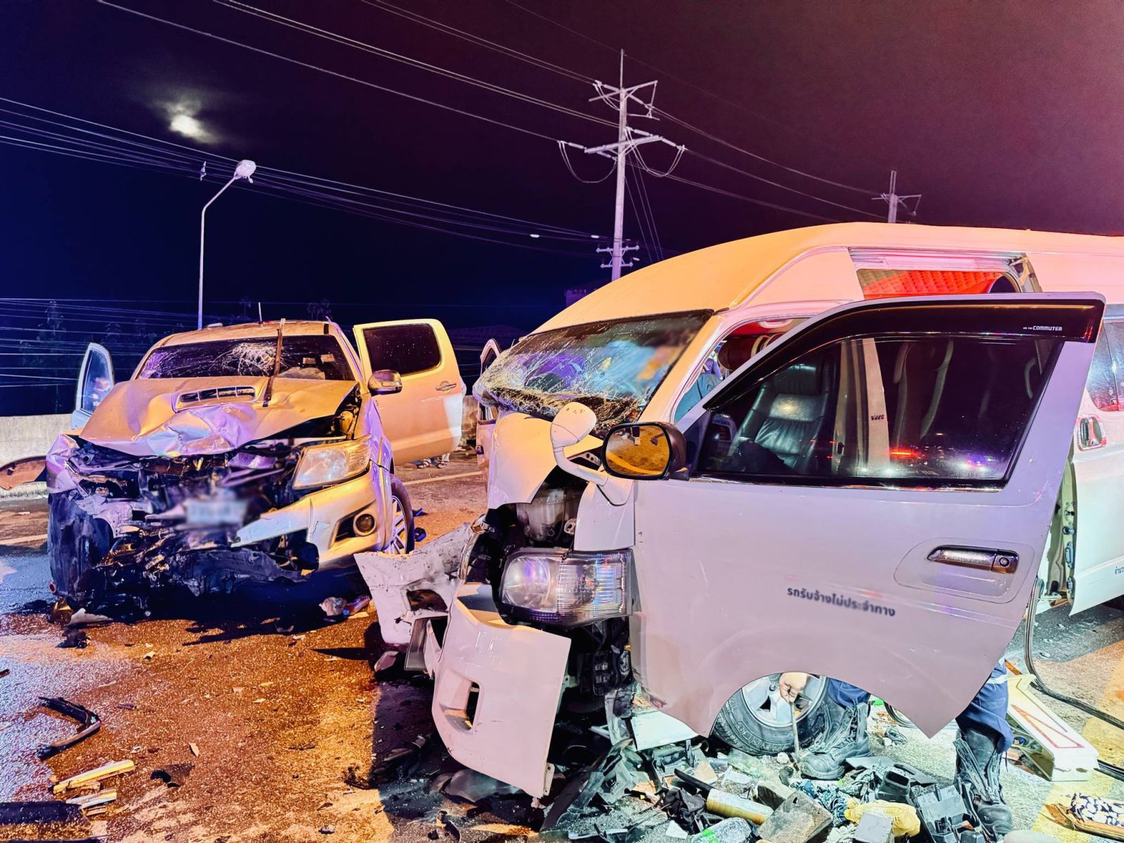 ที่เกิดเหตุ มีแนวซ่อมบำรุงการจราจร เจ้าหน้าที่ต้องปิดการจราจรฝั่งขาล่อง แล้วเบี่ยงใช้เลนพิเศษเป็นเส้นทางสวนกันในฝั่งขาเข้า กทม. โดยพบรถกระบะ โตโยต้า สีทอง ป้ายทะเบียน กทม. ลักษณะชนประสานงา กับรถตู้ โตโยต้า สีขาว ป้ายทะเบียน ปัตตานี