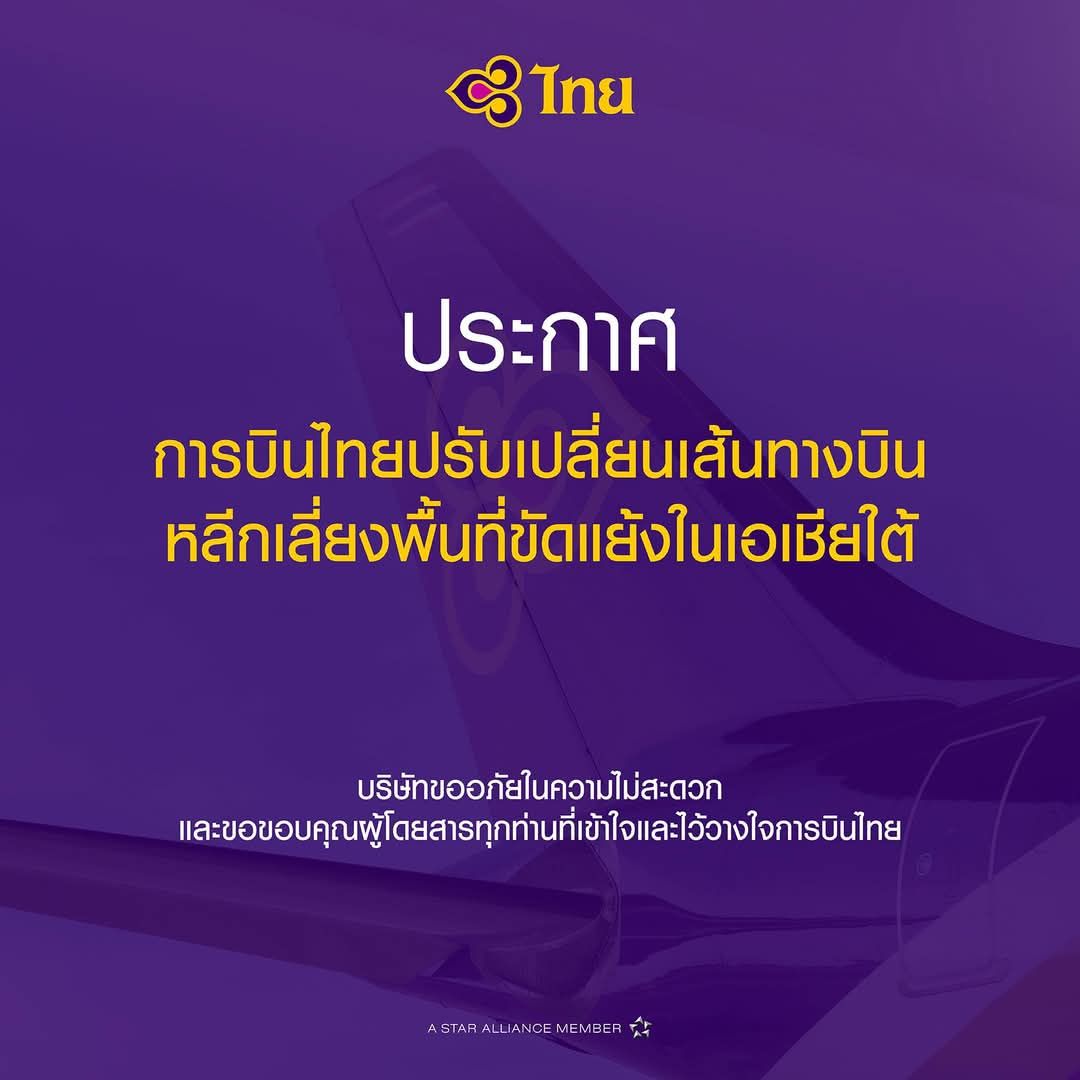 ตามที่ประเทศปากีสถานประกาศปิดน่านฟ้าและสนามบินภายในประเทศบางแห่ง จากกรณีความขัดแย้งในภูมิภาคเอเชียใต้ ส่งผลกระทบต่อเส้นทางบินของเที่ยวบินระหว่างประเทศที่ทำการบินผ่านน่านฟ้าประเทศปากีสถานตั้งแต่ช่วงนั้น เพื่อความปลอดภัยของผู้โดยสาร บริษัท การบินไทย จำกัด (มหาชน) ขอแจ้งให้ทราบว่าบริษัทมีความจำเป็นต้องเปลี่ยนแปลงเส้นทางบินของเที่ยวบินของบริษัทฯ ในเส้นทางบินยุโรปและเอเชียใต้ ตั้งแต่เวลา 05.00 น. ของวันพุธที่ 7 พฤษภาคม 2568 ส่งผลกระทบให้อาจเกิดความล่าช้าของเที่ยวบินบางเที่ยวบินในเส้นทางดังกล่าว