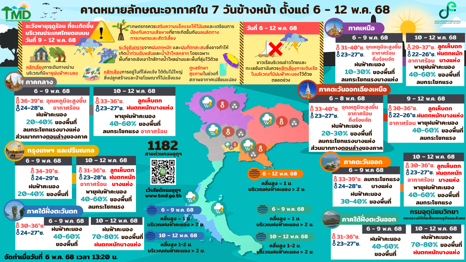 และตั้งแต่วันที่ 9-11 พ.ค.นี้ อากาศจะเริ่มเปลี่ยนอีกครั้ง ทิศทางของลมจะแปรปรวน ทำให้ภาคใต้จะมีฝนมาก โดยเฉพาะฝั่งอันดามัน ต้องระวังพิเศษ อาจมีฝนตกหนักถึงหนักมาก ส่วนภาคเหนือและภาคอีสาน ต้องระวังฝนปานกลางถึงหนัก ขณะที่กรุงเทพมหานคร ยังเจอกันฝนได้ทุกช่วงเวลา โดยเฉพาะช่วงเช้าตรู่ และหลังเลิกงาน ถือเป็นสัญญาณการเปลี่ยนผ่านจากฤดูร้อนไปเป็นฤดูฝน ซึ่งกรมอุตุนิยมวิทยา จะติดตามใกล้ชิด เพื่อดูทิศทางลมและการกระจายตัวของฝน หากเงื่อนไขครบถ้วนก็จะประกาศเข้าสู่ฤดูฝนอย่างเป็นทางการ