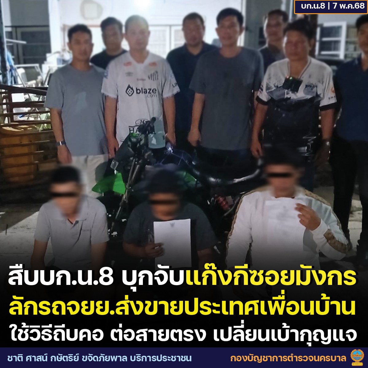 วันที่ 7 พ.ค.68 เวลาประมาณ 03.30 น. เจ้าหน้าที่ฝ่ายสืบสวน บก.น.8 ร่วมกันจับกุม นายกี, นายนุ๊ก, นายบิ๊ก ในความผิดฐาน “ร่วมกันลักทรัพย์ในเวลากลางคืนโดยร่วมกระทำความผิดด้วยกันตั้งแต่สองคนขึ้นไป โดยการมอมหน้าหรือกระทำด้วยประการอื่นเพื่อไม่ให้เห็น หรือจำหน้าได้ โดยใช้ยานพาหนะเพื่อสะดวกแก่การกระทำผิด หรือการพาทรัพย์นั้นไป หรือเพื่อให้พ้นจากการจับกุม”