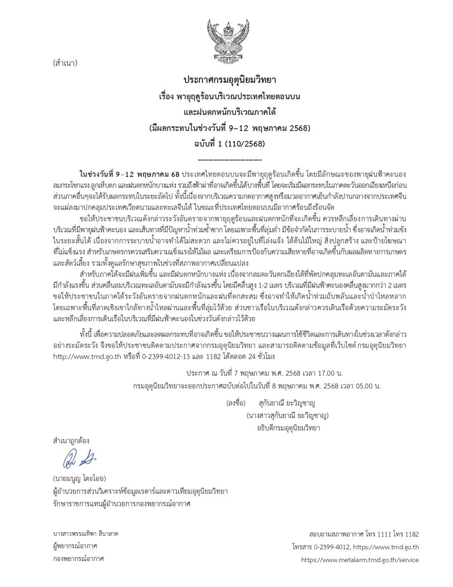 ประกาศกรมอุตุนิยมวิทยาเรื่อง พายุฤดูร้อนบริเวณประเทศไทยตอนบน และฝนตกหนักบริเวณภาคใต้ (มีผลกระทบในช่วงวันที่ 9–12 พฤษภาคม 2568) ฉบับที่ 1 (110/2568)