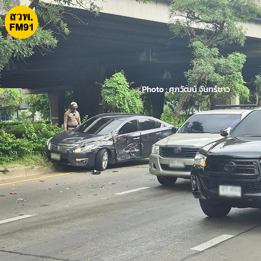 ปากซอยประดิษฐ์มนูธรรม 23 รถเครนชนกับรถเก๋ง กีดขวางเลนขวา จนท.เคลื่อนย้ายพ้นแล้ว ท้ายอยู่หน้าปั้มบางจาก (ตรงข้าม ถ.อินทราภรณ์)