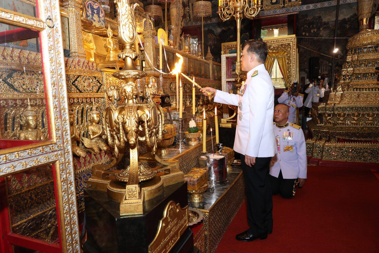 โอกาสนี้ ทรงรับกระทงดอกไม้จากเจ้าพนักงานพระราชพิธี แล้วทรงวางบนพานหน้าฐานชุกชี ทรงจุดธูปเทียนเครื่องนมัสการท้ายที่นั่ง ทรงจุดเทียนห่วงบูชาพระพุทธมหามณีรัตนปฏิมากร จากนั้น ทรงจุดธูปเทียนเครื่องนมัสการท้ายที่นั่งบูชาพระพุทธยอดฟ้าจุฬาโลกย์ และพระพุทธเลิศหล้านภาไลย เสร็จแล้ว พระบาทสมเด็จพระเจ้าอยู่หัว ทรงจุดธูปเทียนเครื่องนมัสการทองใหญ่ที่หน้าธรรมาสน์ศิลา สมเด็จพระนางเจ้า ฯ พระบรมราชินี ทรงจุดธูปเทียนเครื่องนมัสการทองทิศที่หน้าธรรมาสน์ศิลา ทรงศีล เมื่อพระราชวชิรโมลี ผู้ช่วยเจ้าอาวาสวัดระฆังโฆสิตาราม ประธานสงฆ์ถวายศีล จบ เสด็จพระราชดำเนินไปที่ธรรมาสน์ศิลา ทรงพระสุหร่ายสรงพระพุทธปฏิมาชัยวัฒน์ รัชกาลที่ 9, พระคันธารราษฎร์องค์ใหญ่ รัชกาลที่ 10, พระคันธารราษฎร์จีนนั่ง รัชกาลที่ 10, พระคันธารราษฎร์จีนยืน รัชกาลที่ 10, พระคันธารราษฎร์บันได รัชกาลที่ 10, พระคันธารราษฎร์รวงข้าว รัชกาลที่ 10, พระบัวเข็ม, พระพลเทพ, พระโคศุภราช และทรงประพรมพืชต่าง ๆ ซึ่งตั้งอยู่บนโต๊ะ 2 ข้างนั้นด้วย แล้วทรงโปรยดอกไม้และถวายพวงมาลัยที่พระพุทธรูปทุกองค์