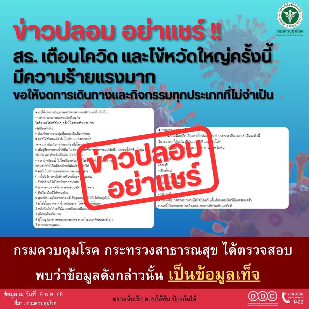 ข่าวปลอม! อย่าแชร์ ย้อนกลับมาส่งต่ออีกแล้ว สธ เตือนโควิด-ไข้หวัดใหญ่ครั้งนี้ มีความร้ายแรงมาก ขอให้งดการเดินทางและกิจกรรมทุกประเภทที่ไม่จำเป็น