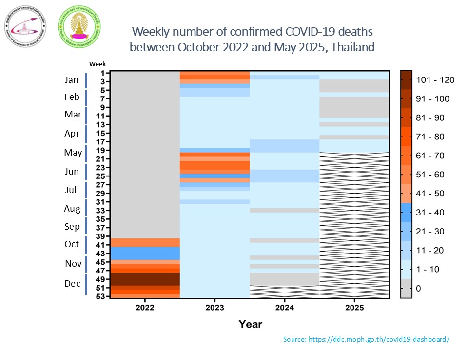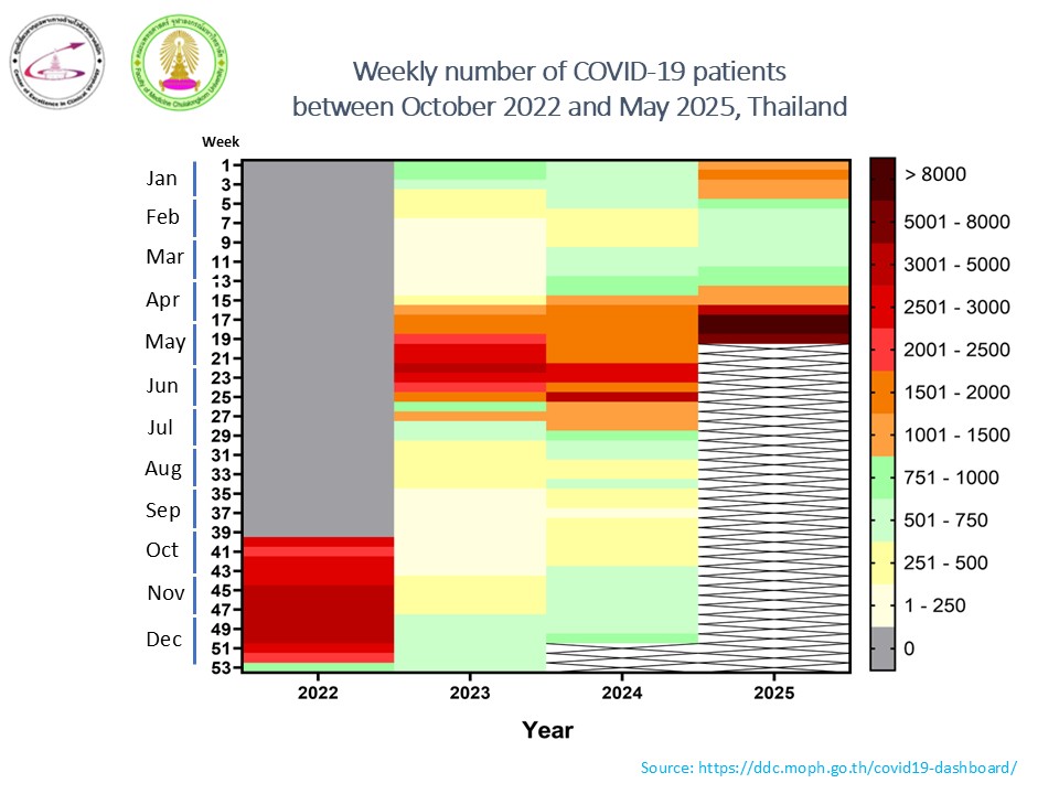9 พฤษภาคม 2568 ศ.นพ.ยง ภู่วรวรรณ ราชบัณฑิต สำนักวิทยาศาสตร์ ศูนย์เชี่ยวชาญเฉพาะทางด้านไวรัสวิทยาคลินิก คณะแพทย์ศาสตร์ จุฬาลงกรณ์มหาวิทยาลัย ให้ข้อมูลผ่านเฟซบุ๊กส่วนตัว ว่า โควิด 19 กำลังระบาดอย่างมากในประเทศไทยโดยฤดูกาลของโควิด 19 ได้เริ่มต้นตั้งแต่สงกรานต์เป็นต้นมา และจะระบาดมากขึ้นอีกเมื่อนักเรียนเปิดเทอมในปีนี้ เนื่องจากฝนมาเร็ว การระบาดในช่วงนี้ จึงมีผู้ป่วยจำนวนมากกว่าปีที่แล้ว จำนวนยอดผู้ป่วยที่แท้จริง มิอาจจะทราบได้ แต่ยอดจำนวนผู้ป่วยที่นอนในโรงพยาบาล แต่เห็นได้ชัดเจนจากรูปที่ให้ดู ในปีนี้มากกว่าปีที่แล้ว สีเข้มชัดเจน สัปดาห์ละ มากกว่า 5,000 คน สีที่เห็นจากรูปจึงเป็นสีเข้มแดง