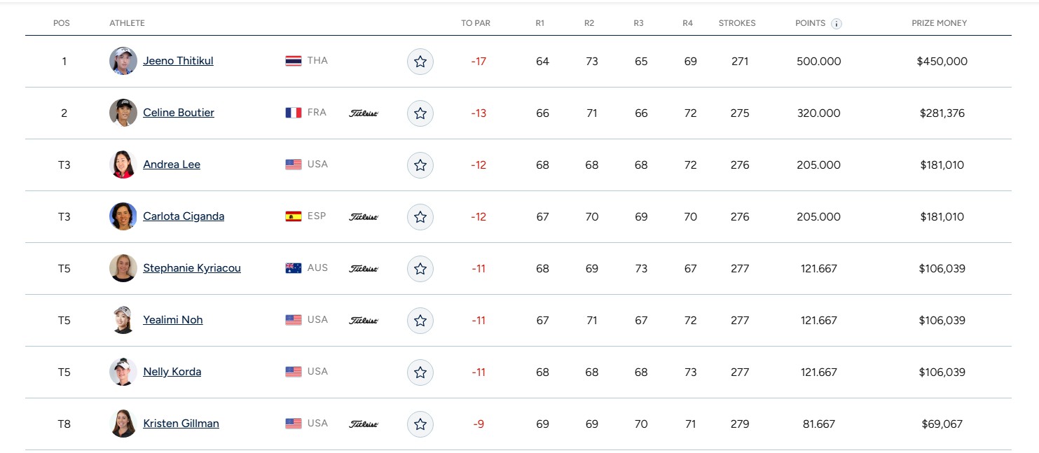 การแข่งขันกอล์ฟ แอลพีจีเอ ทัวร์ รายการ “มิซูโฮ อเมริกาส์ โอเพ่น” ชิงเงินรางวัลรวม 3 ล้านดอลลาร์สหรัฐ (ราว 99 ล้านบาท) ที่สนาม ลิเบอร์ตี เนชันแนล กอล์ฟ คลับ ระยะ 6,677 หลา พาร์ 72 เมืองเจอร์ซีย์ รัฐนิวเจอร์ซีย์ ประเทศสหรัฐ เมื่อวันที่11 พฤษภาคม 2568 ที่ผ่านมา เป็นการดวลวงสวิงในรอบสุดท้าย ผลปรากฏว่า “จีโน่” อาฒยา ฐิติกุล โปรสาวขวัญใจชาวไทย ยังคงทำผลงานได้อย่างยอดเยี่ยม หลังเก็บเพิ่มอีก 3 อันเดอร์พาร์ 79 ด้วยการทำ 3 เบอร์ดี โดยไม่เสียโบกีเลยตลอดทั้งวัน คว้าแชมป์ไปครองเป็นรายการแรกของปีนี้ และรายการที่ 5 ในแอลพีจีเอทัวร์ ด้วยสกอร์รวม 17 อันเดอร์พาร์ 271 พร้อมรับเงินรางวัล 450,000 ดอลลาร์สหรัฐ (ราว 14.85 ล้านบาท)