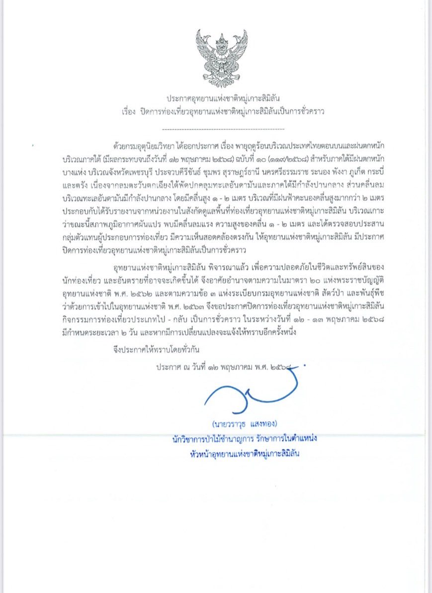 ดังนั้น อุทยานแห่งชาติหมู่เกาะสิมิลันได้พิจารณาแล้วว่า เพื่อความปลอดภัยในชีวิตและทรัพย์สินของนักท่องเที่ยว และอันตรายที่อาจจะเกิดขึ้นได้ จึงอาศัยอำนาจตามความในมาตรา 20 แห่งพระราชบัญญัติอุทยานแห่งชาติ พ.ศ.2563 และตามความข้อ 3 แห่งระเบียบกรมอุทยานแห่งชาติ สัตว์ป่า และพันธุ์พืช ว่าด้วยการเข้าไปในอุทยานแห่งชาติ พ.ศ.2563 จึงขอประกาศปิดการท่องเที่ยวอุทยานแห่งชาติหมู่เกาะสิมิลัน กิจกรรมการท่องเที่ยวประเภทไป-กลับเป็นการชั่วคราว ในระหว่างวันที่ 12-13 พ.ค.68 มีกำหนดระยะเวลา 2 วัน และหากมีการเปลี่ยนแปลงจะแจ้งให้ทราบอีกครั้งหนึ่ง
