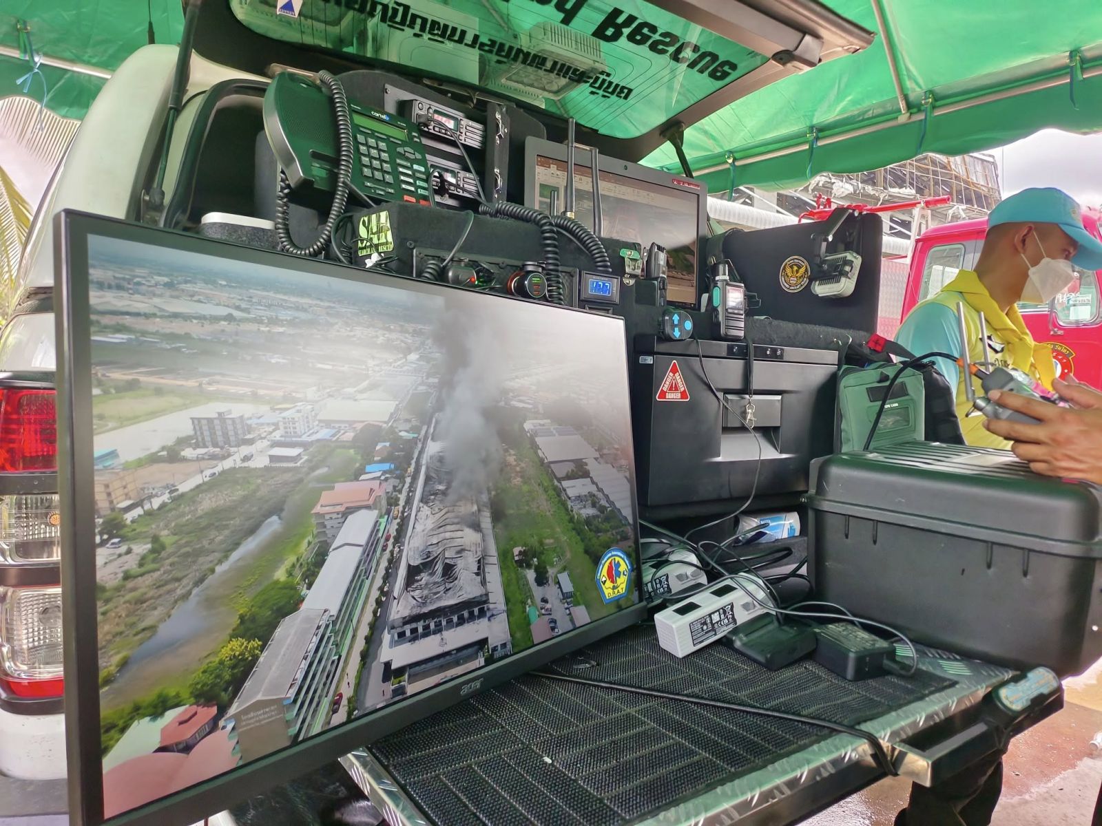 จากนั้น ได้ลงพื้นที่สังเกตการณ์บริเวณที่เกิดเหตุยังคงมีกลุ่มควันไฟปกคลุมอยู่จำนวนมาก เจ้าหน้าที่กู้ภัยและดับเพลิงรายงานว่า สถานการณ์ในตอนนี้เบาลงแล้ว แต่ยังคงมีกลุ่มเปลวไฟใต้ชั้นอาคารยังคงมีการปะทุอยู่เล็กน้อย เจ้าหน้าที่ได้เจาะผนังกำแพงรอบตัวโรงงาน เพื่อลำเลียงท่อน้ำเข้าไปในภายใต้อาคารทั้งสองหลังเพื่อฉีดน้ำเลี้ยง