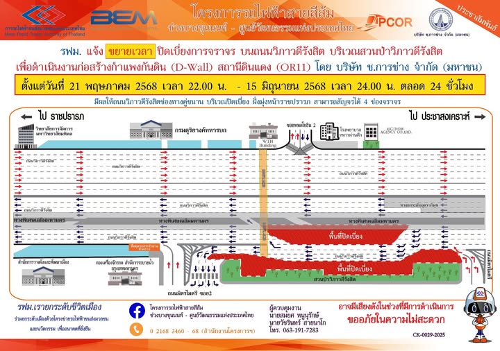 การรถไฟฟ้าขนส่งมวลชนแห่งประเทศไทย (รฟม.) แจ้งว่า บริษัท ช.การช่าง จำกัด (มหาชน) ผู้รับจ้างออกแบบและก่อสร้างอุโมงค์ทางวิ่งและสถานีใต้ดิน โครงการรถไฟฟ้าสายสีส้ม ช่วงบางขุนนนท์ – ศูนย์วัฒนธรรมแห่งประเทศไทย มีความจำเป็นต้องขยายเวลาปิดเบี่ยงการจราจร บนถนนวิภาวดีรังสิต บริเวณสวนป่าวิภาวดีรังสิตเพื่อดำเนินงานก่อสร้างกำแพงกันดิน (D-Wall) สถานีดินแดง (OR11) ตั้งแต่วันที่ 21 พฤษภาคม 2568 เวลา 22.00 น. - 15 มิถุนายน 2568 เวลา 24.00 น. ตลอด 24 ชั่วโมง โดยมีรายละเอียดดังนี้