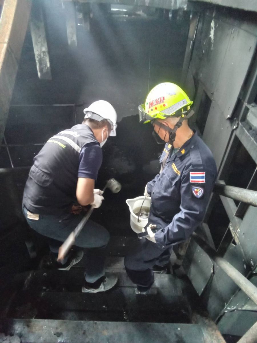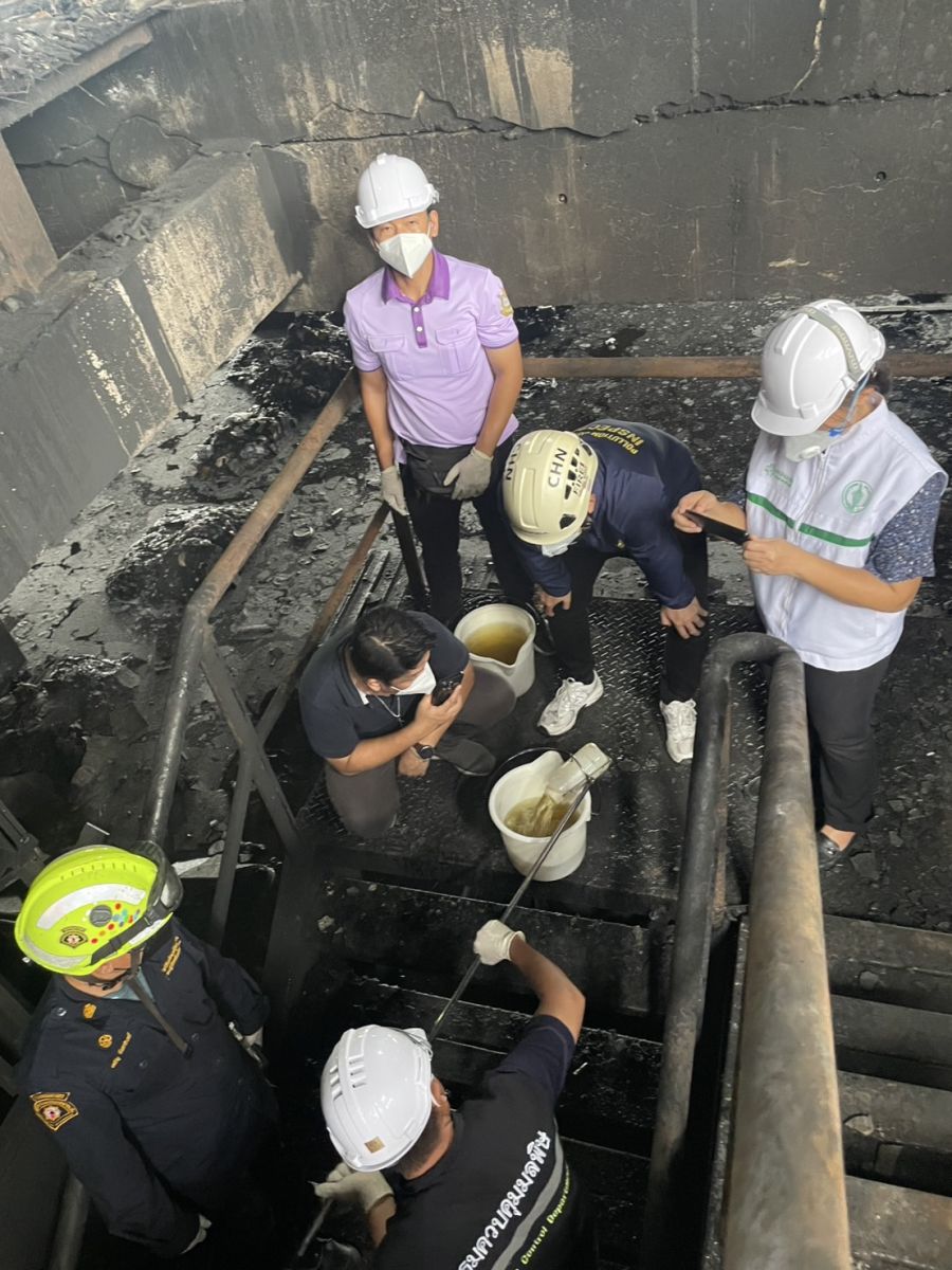 3. จากการตรวจสอบภายในพื้นที่อาคารที่เกิดเหตุเพลิงไหม้ พบว่า มีน้ำที่เกิดจากการดับเพลิงท่วมขังอยู่ภายในชั้นใต้ดินของอาคาร จึงได้เก็บตัวอย่างน้ำในบริเวณดังกล่าวไปตรวจวิเคราะห์ค่าโลหะหนัก จำนวน 2 จุด ทั้งนี้ ได้แนะนำให้สำนักงานเขตลาดกระบัง แจ้งบริษัทฯ ปิดกั้นไม่ให้น้ำในท่อระบายน้ำฝนไหลออกสู่ภายนอก และจัดการกากของเสียที่เหลืออยู่ให้ถูกต้องตามหลักวิชาการ